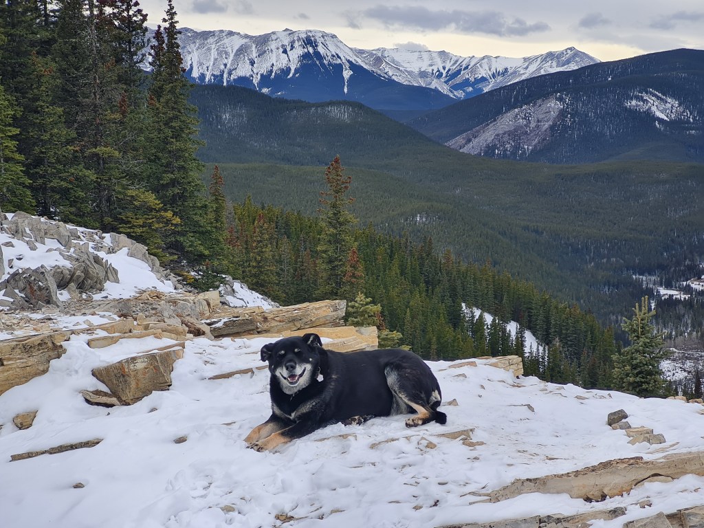 White Buddha (300 m elev. gain) Kona (almost 13 yrs) on White Buddha in late January, a favourite short, steep winter hike in a PLUZ (public land use zone) area.