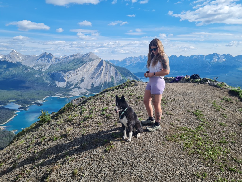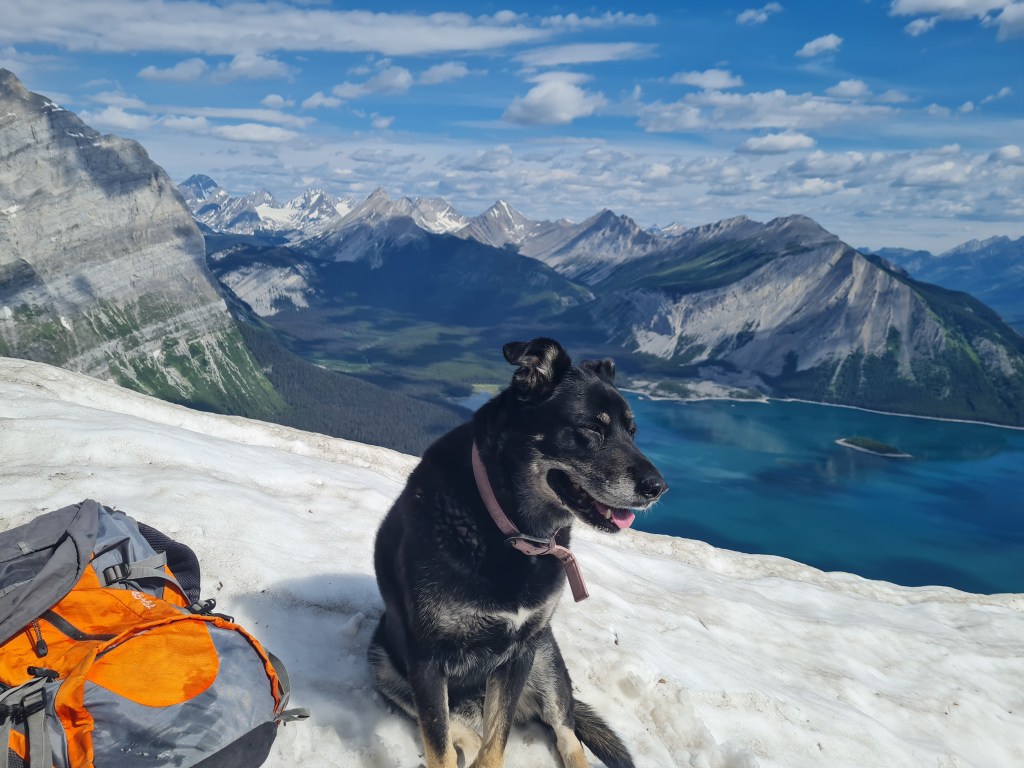 Kaleeve (2 yrs) and friend on ridge with Mt. Indefatigable and Upper Kananaskis Lake below.