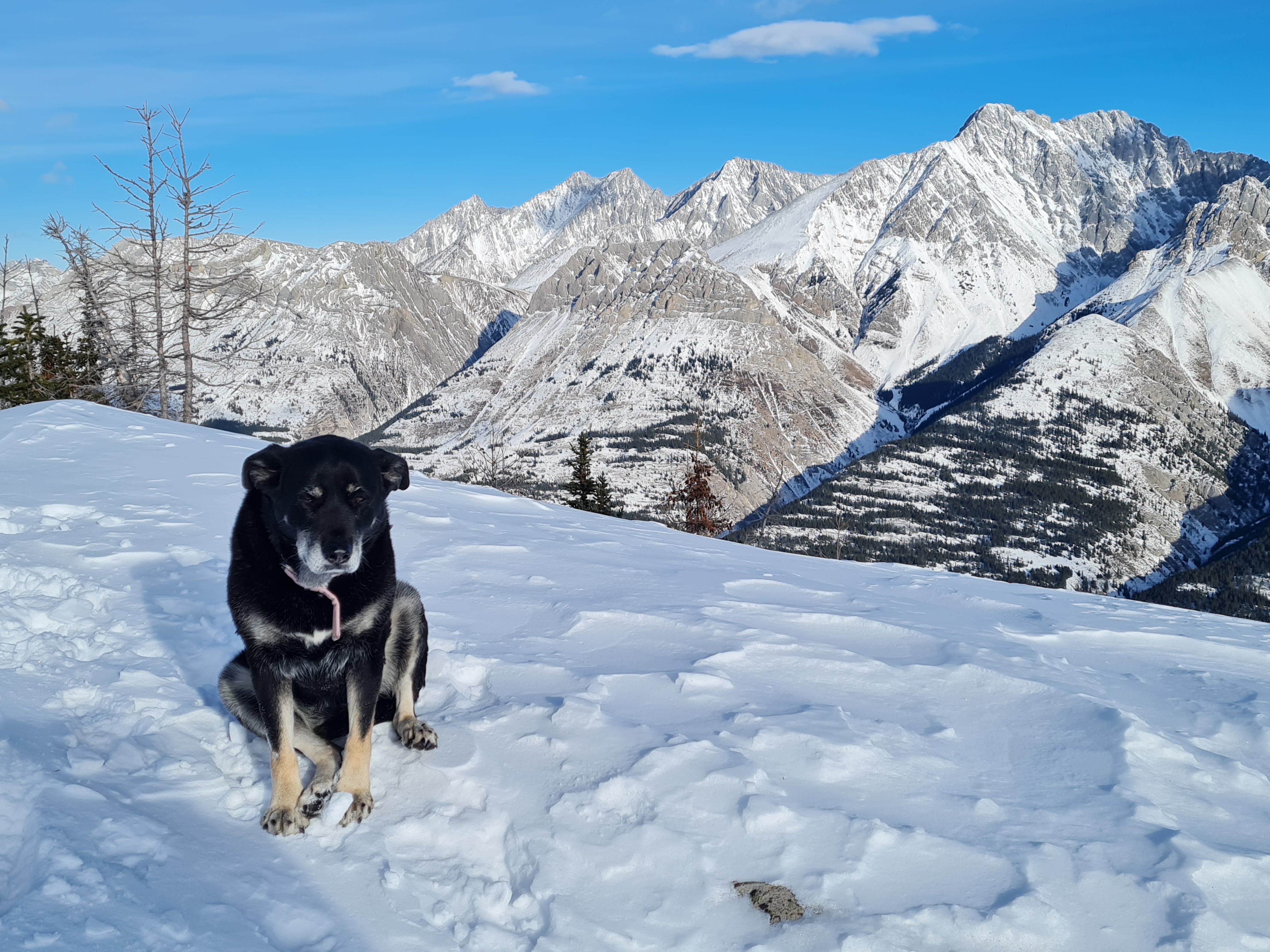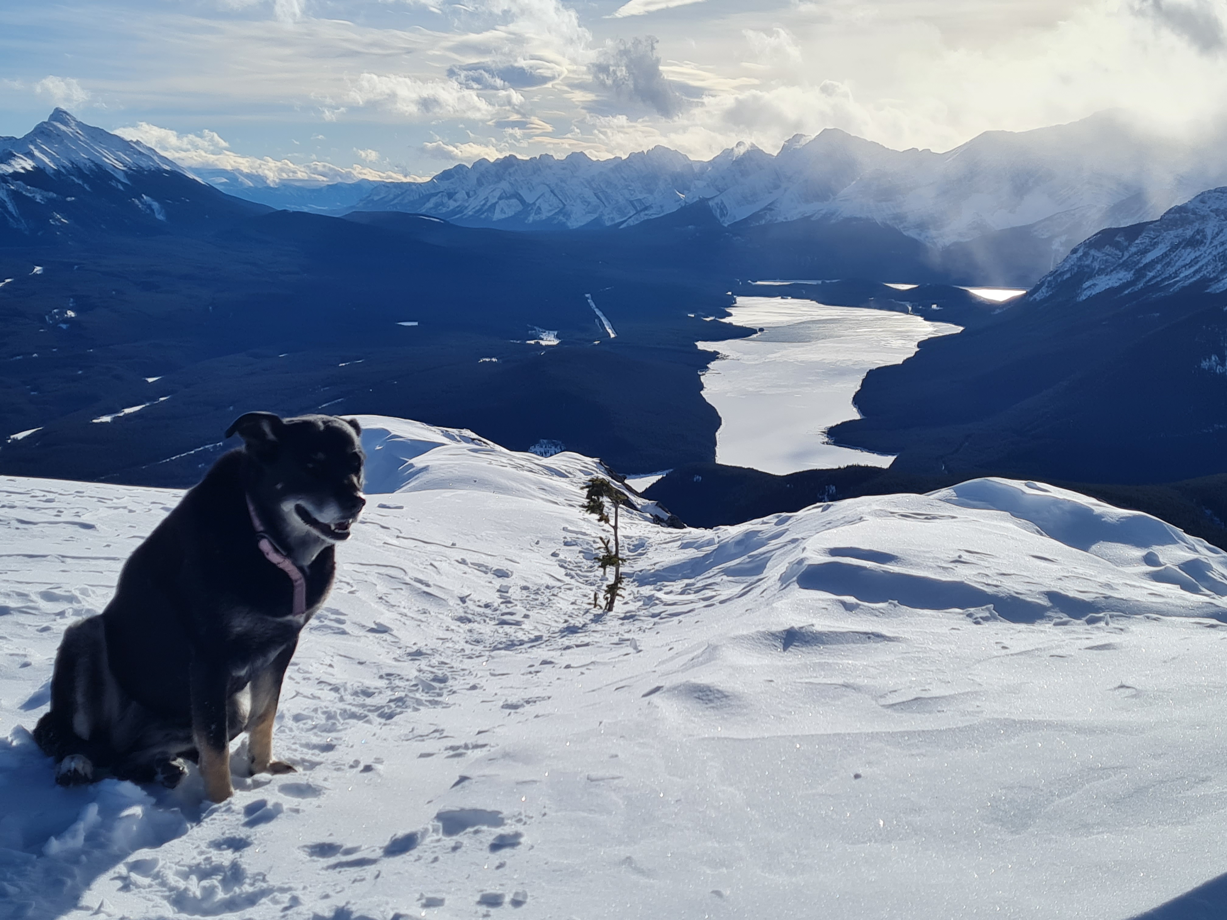Kona on Lawson South in early winter with Kananaskis Lakes below, Mt. Pocaterra at left, Mt. Fox scramble ridge directly behind the left shore of the lakes, lower slope of Mt. Indefatigable at right foreground.