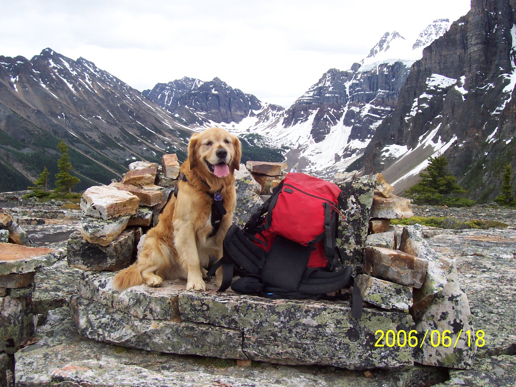 Kona on Heart Mountain / Grant MacEwan Peak traverse in mid-July. Door Jamb Mountain, Loder Peak, Goat Mountain and Mount Yamnuska across Bow Valley behind.