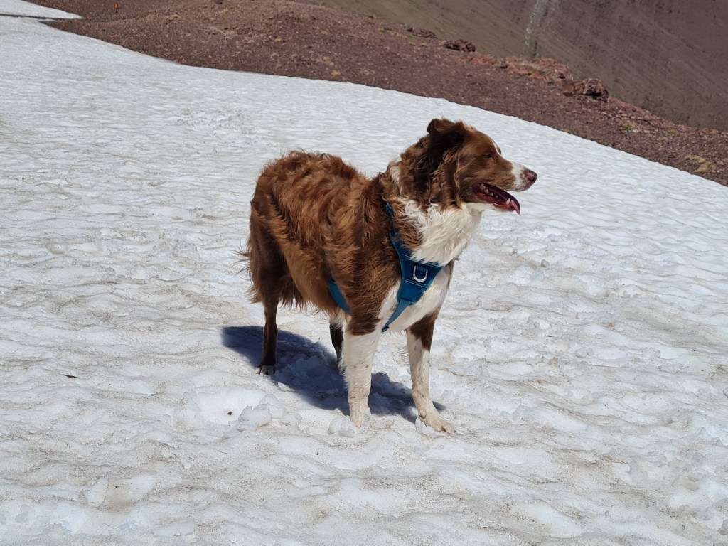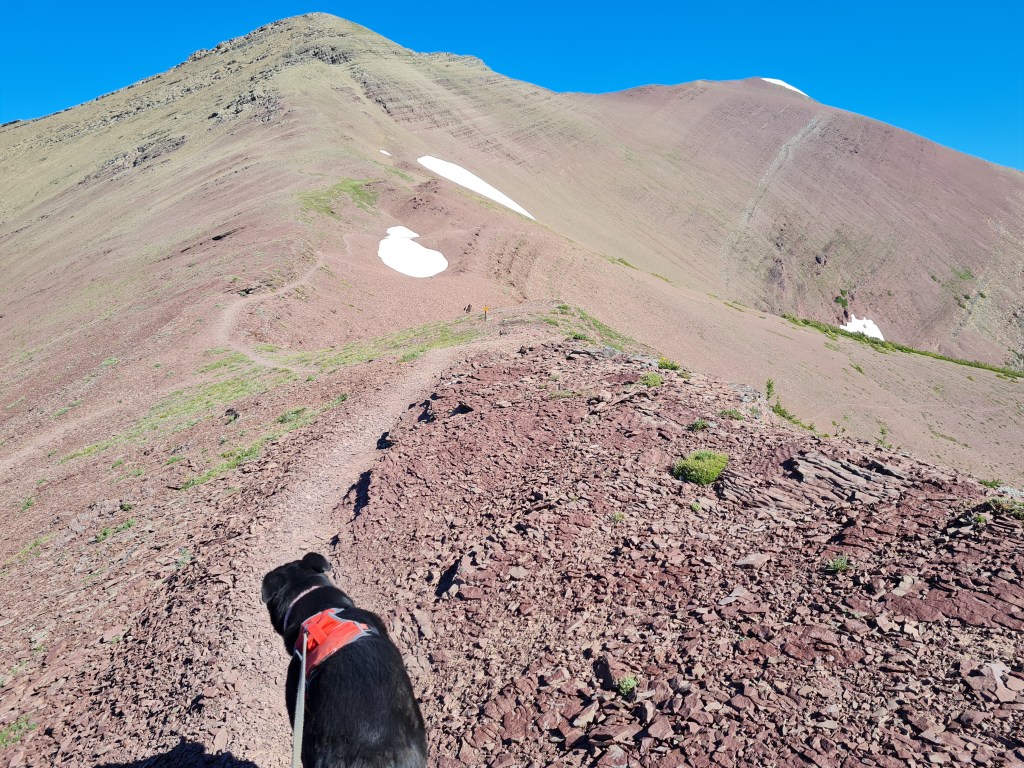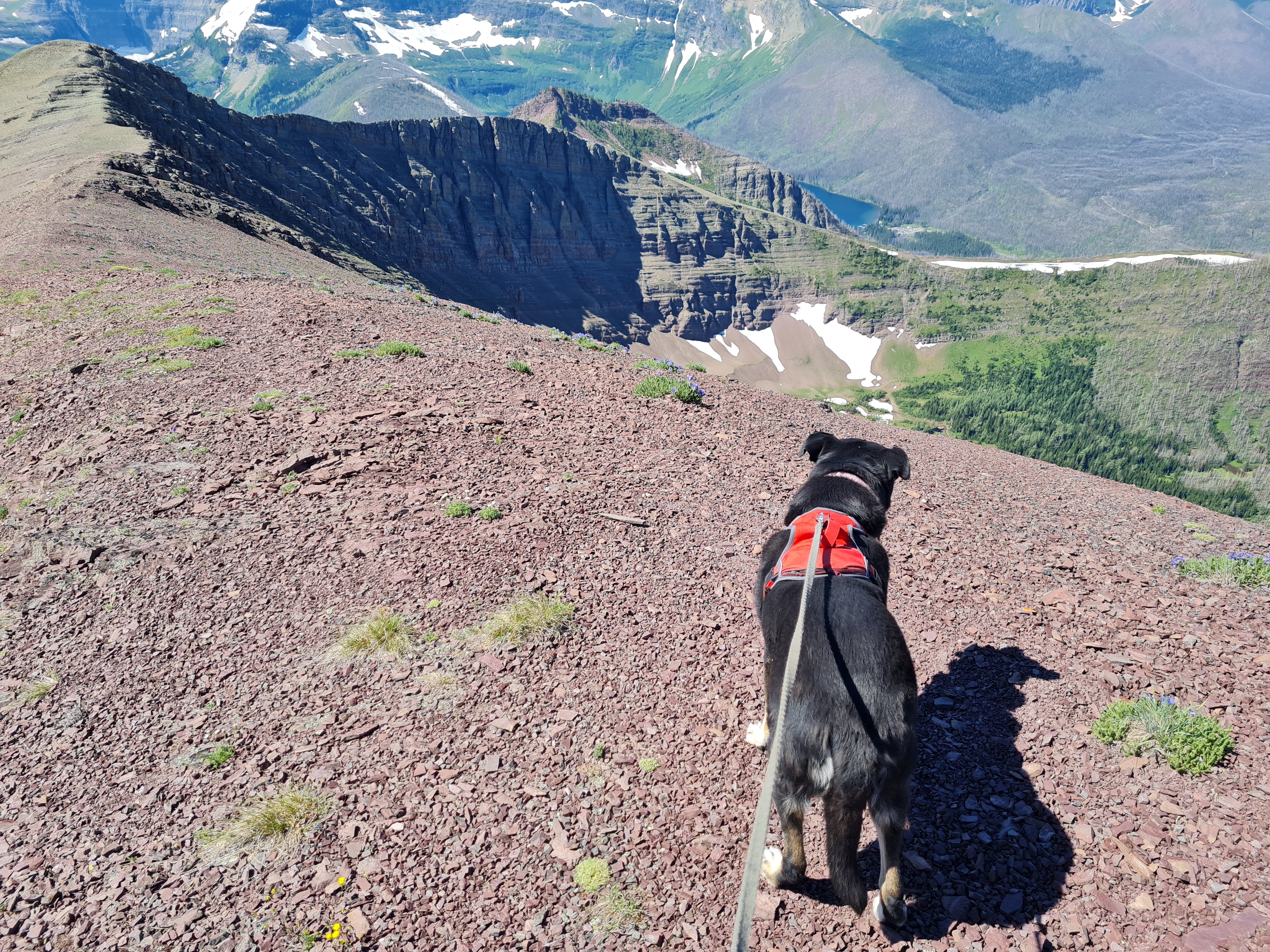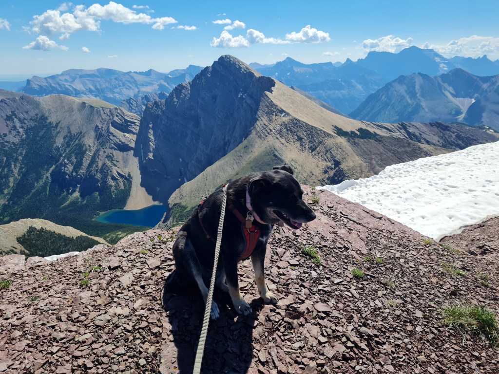 Kona (10 years) on Mt. Carthew in late-July with one of the three Carthew lakes and Mt. Alderson behind.