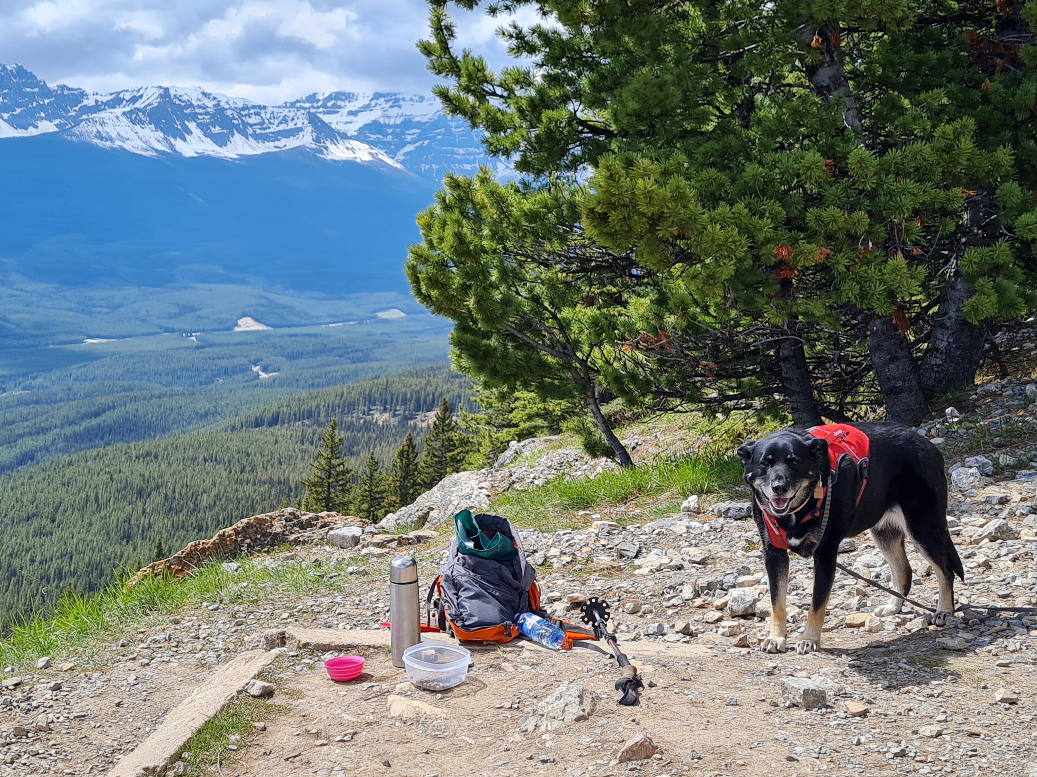 Castle Mtn Lookout (560 m elev gain) Kona Castle Mtn. Lookout Kona making friends at Castle Mountain Lookout (site of former Eisenhower Fire Lookout) on first day of Spring. Kona Castle Mtn Lookout Mount Temple in the clouds to the west. Bow Valley below. Castle Mtn Lookout trail Lake Louise Arnica, maybe.