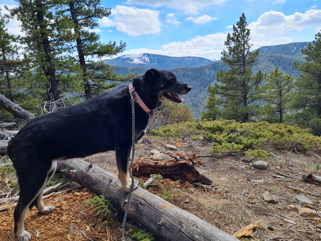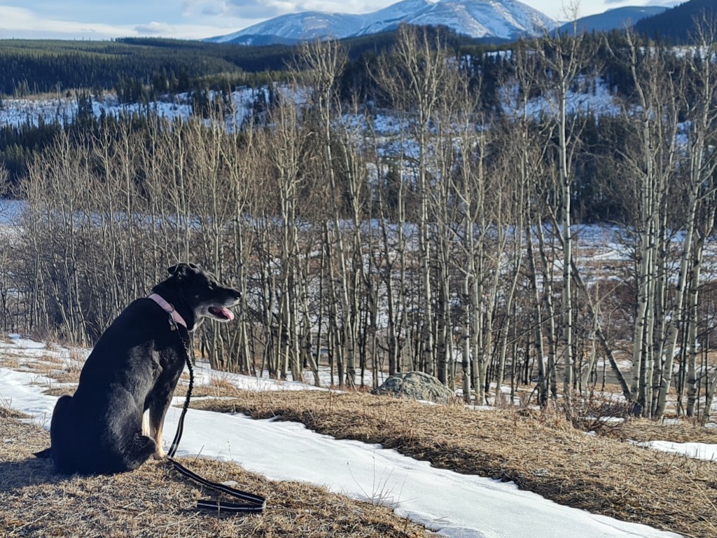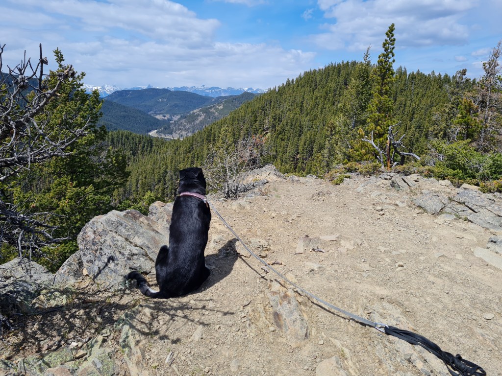 Kona on east peak of Deer Ridge with Yamnuska in background, on a warm early February day.