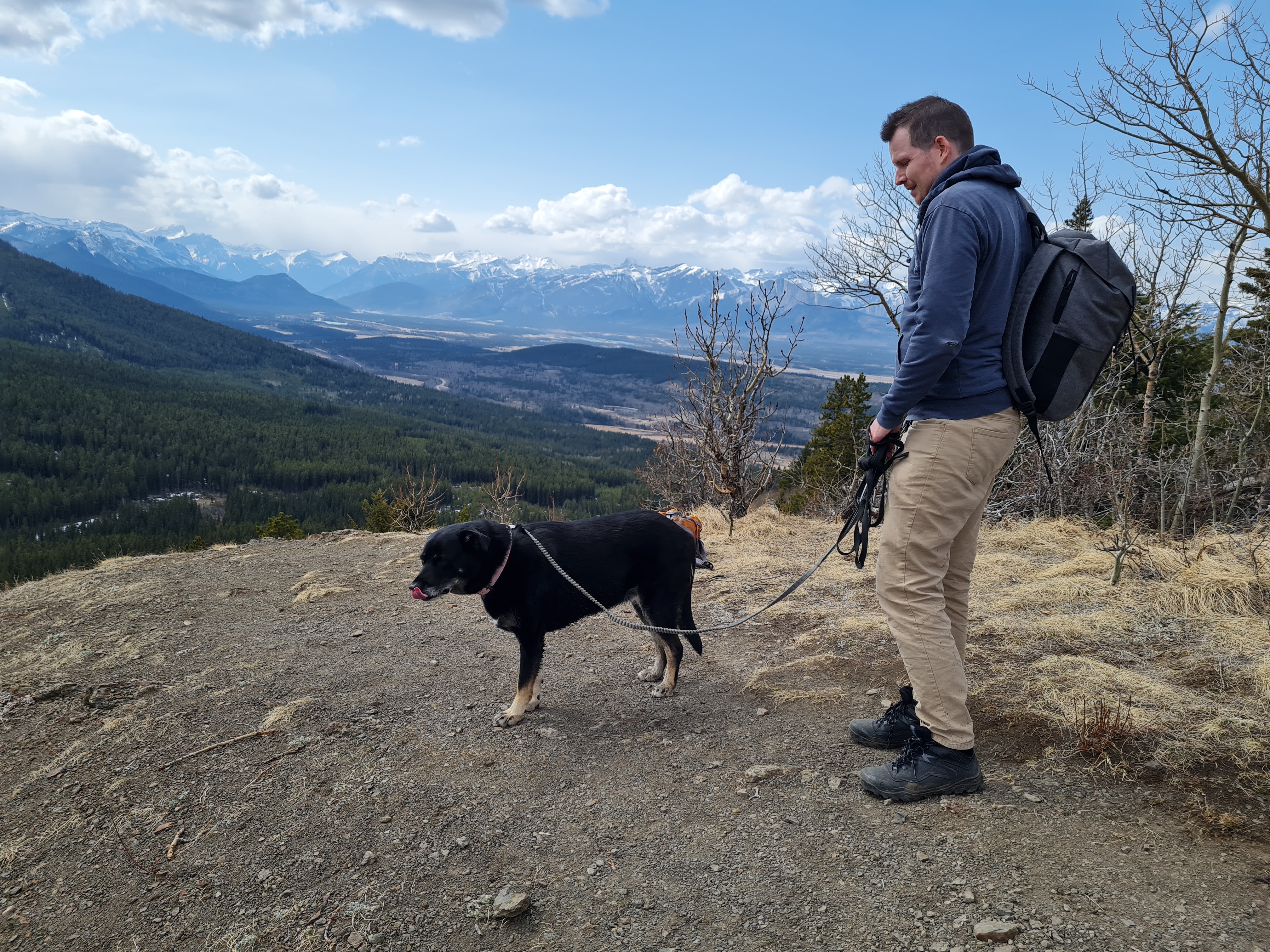 Kona and “brother” Jason on Eagle Hill in late April after a much longer than expected hike in from Sibbald Lake trailhead. View of Bow Valley corridor and Mt. Yamnuska behind.