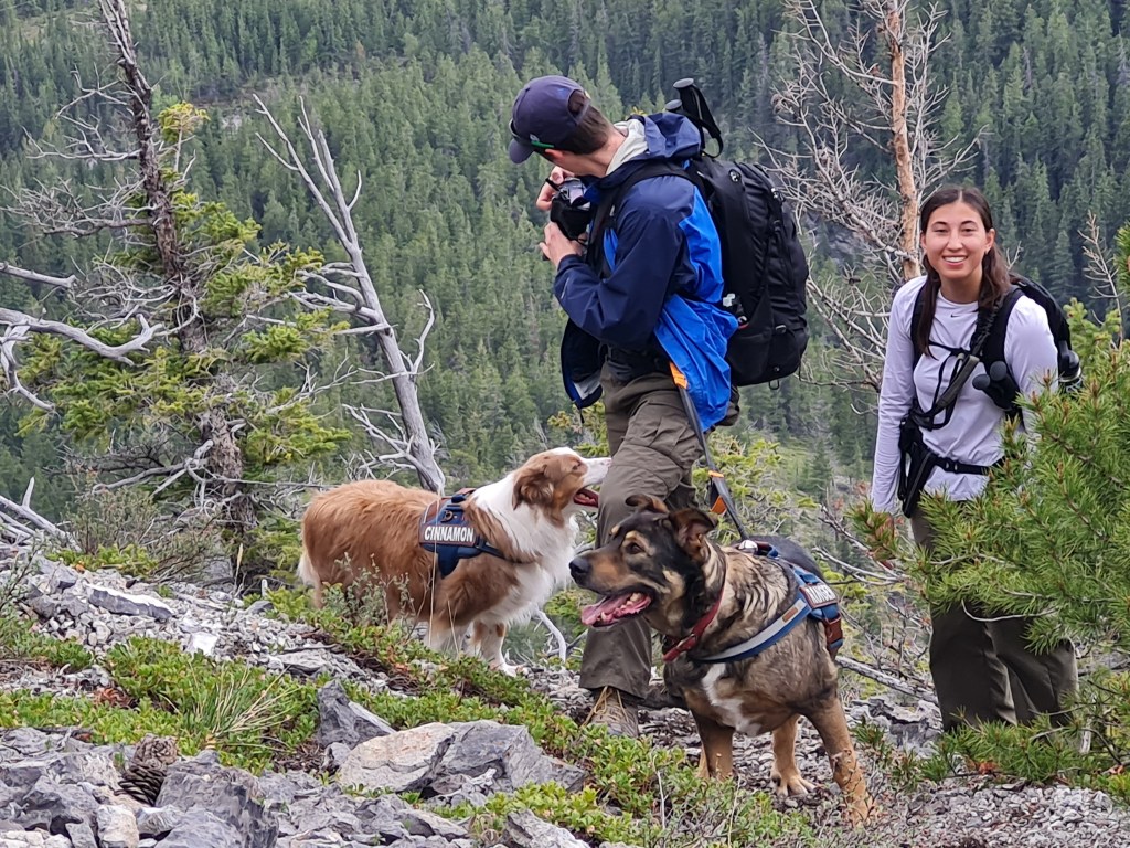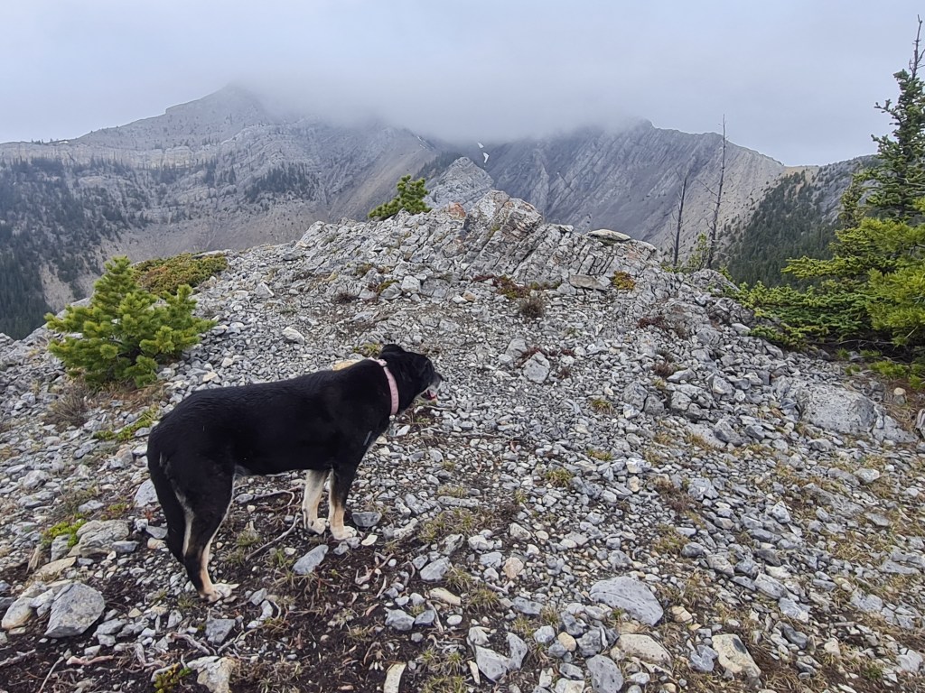 Kona practicing social distancing in late May. Pigeon, Lougheed, WindTower, Rimwall, Orphan, Three Sisters peaks behind, still quite snowy. Gap Lake on Bow River below.
