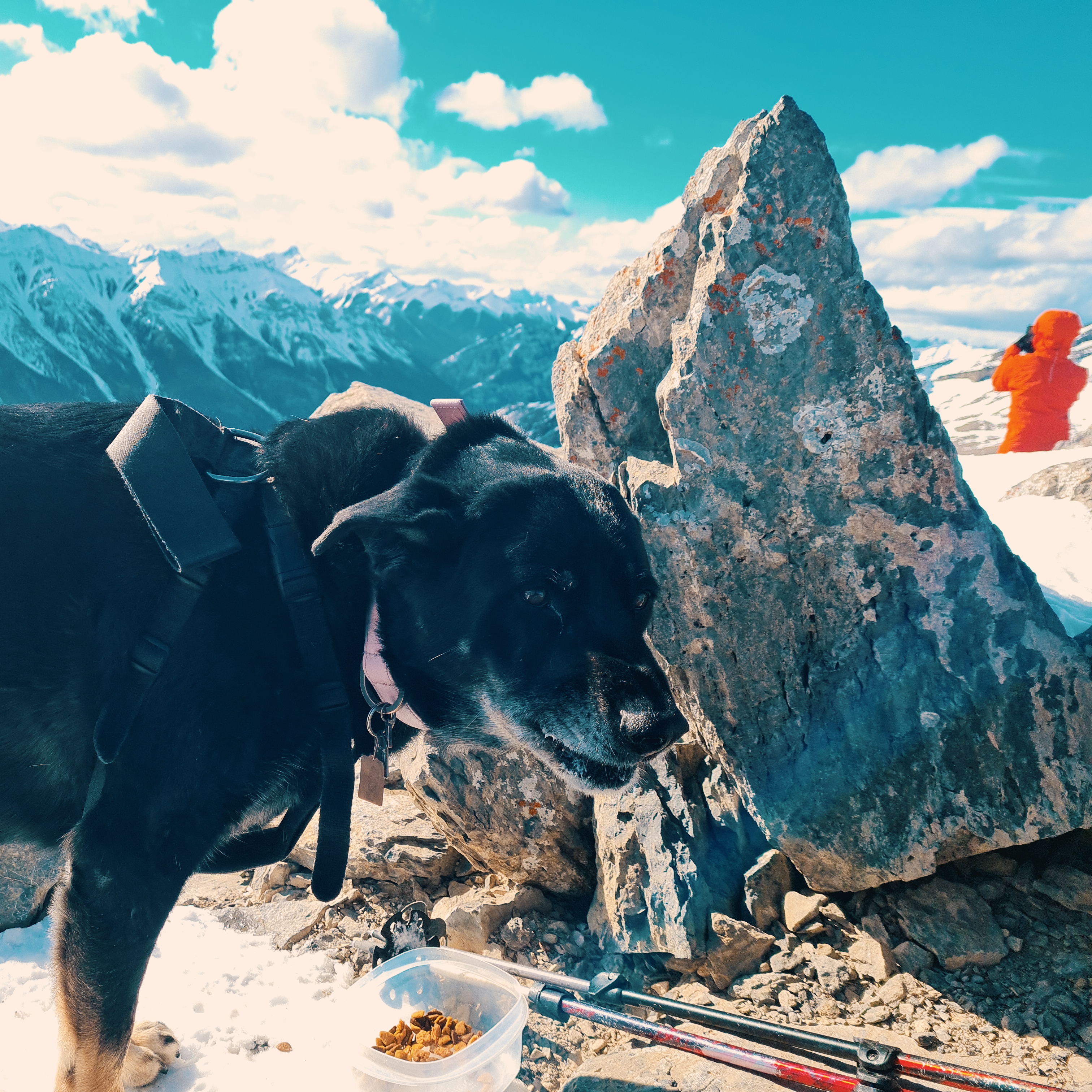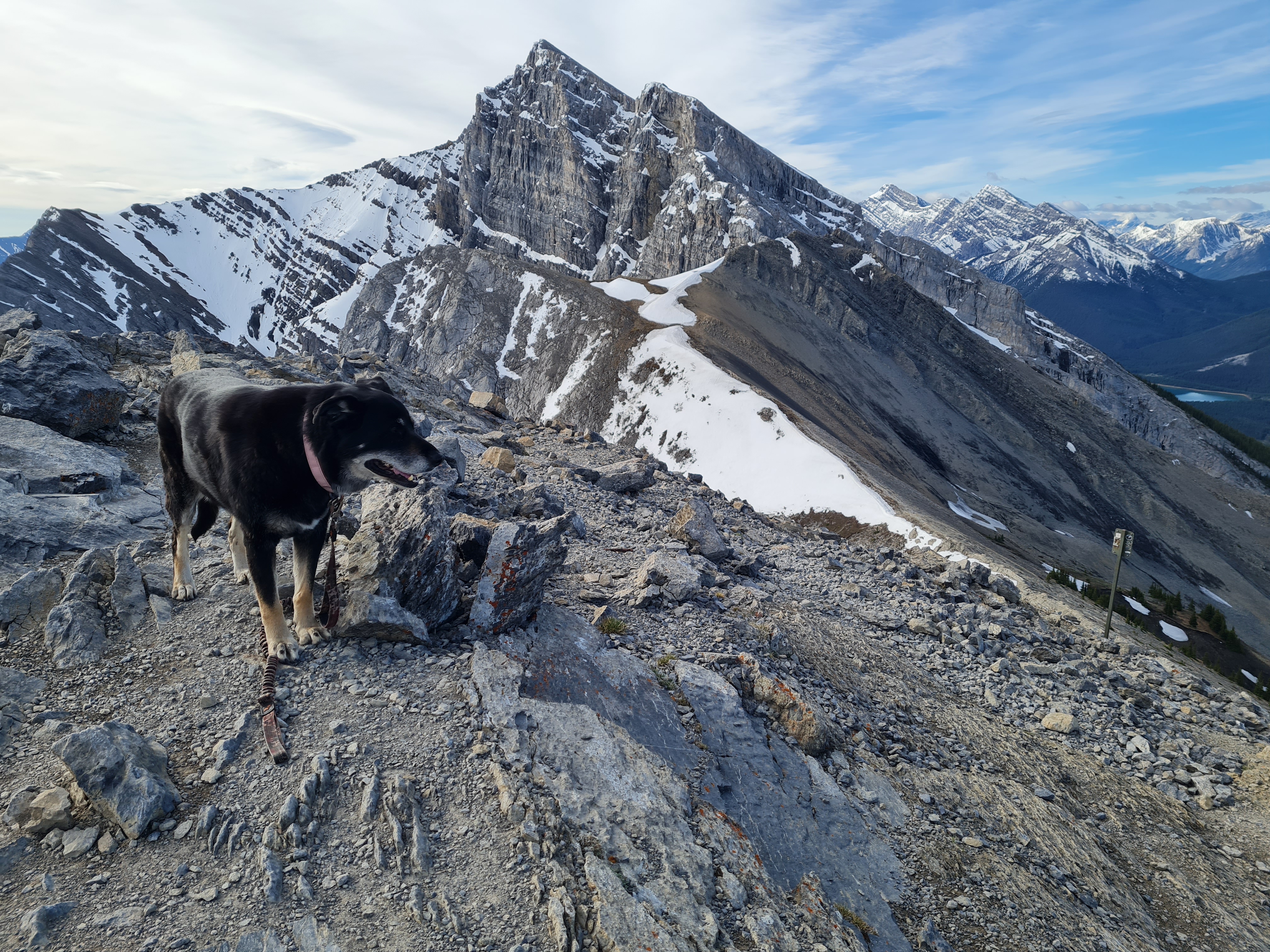 Sheltering from the cold early morning wind on Ha Ling in late May, looking toward Lawrence Grassi peak.