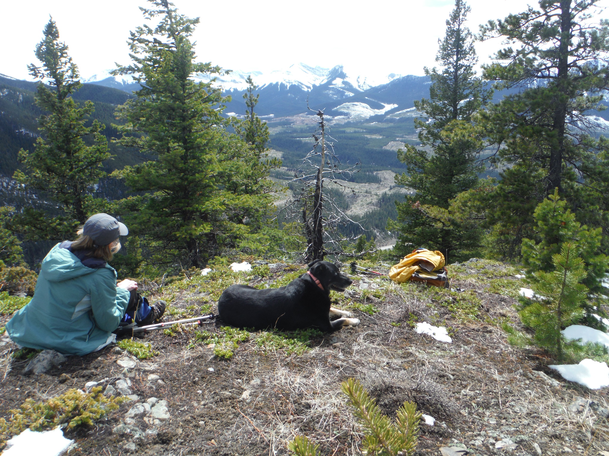 Horton Hill and Ridge (600 m elev. gain) Kona and Friend on Horton Ridge Found a viewpoint between the trees and deadfall on Horton Ridge just past Horton Hill in early May. View up Lusk Creek valley with significant snow load still on peaks.