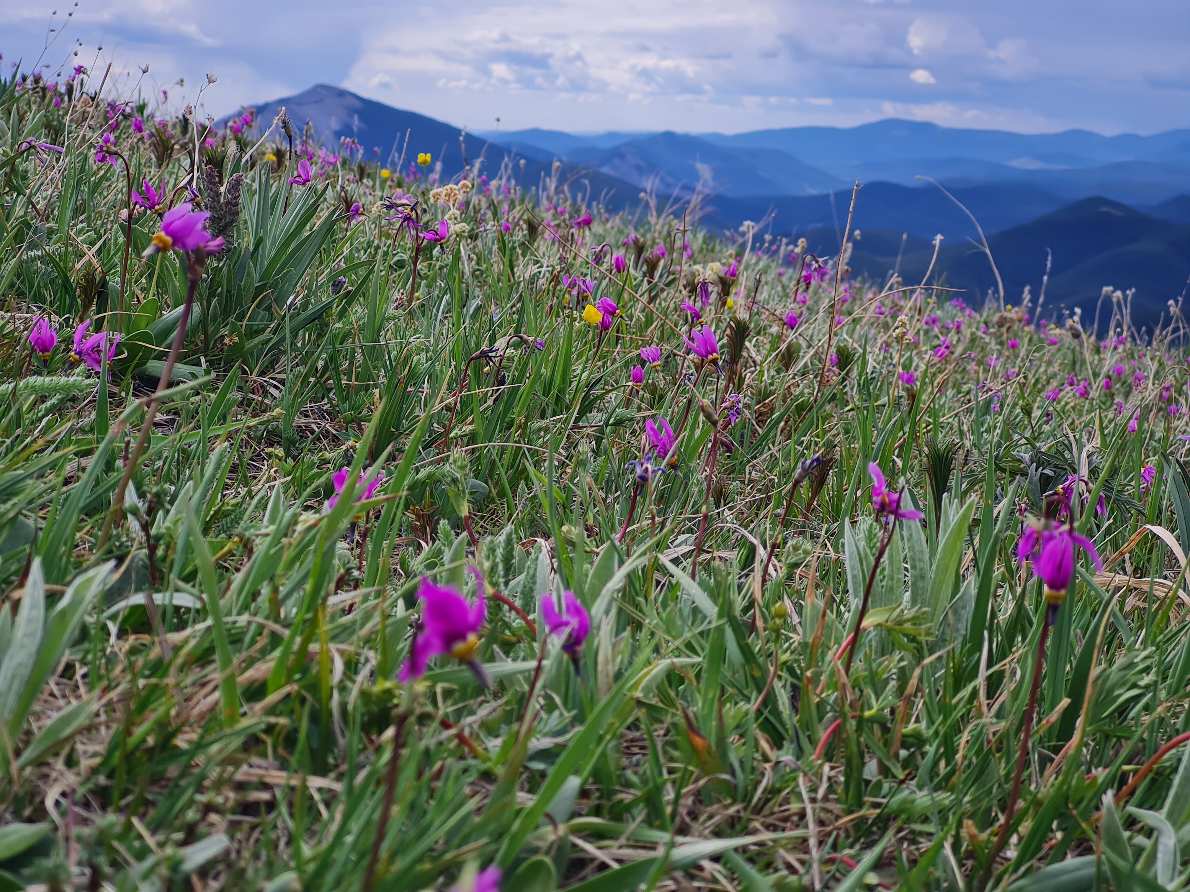 Two weeks later, early June, mountain shooting stars (Primula conjugens) on the slopes previously covered by blooming prairie crocuses.