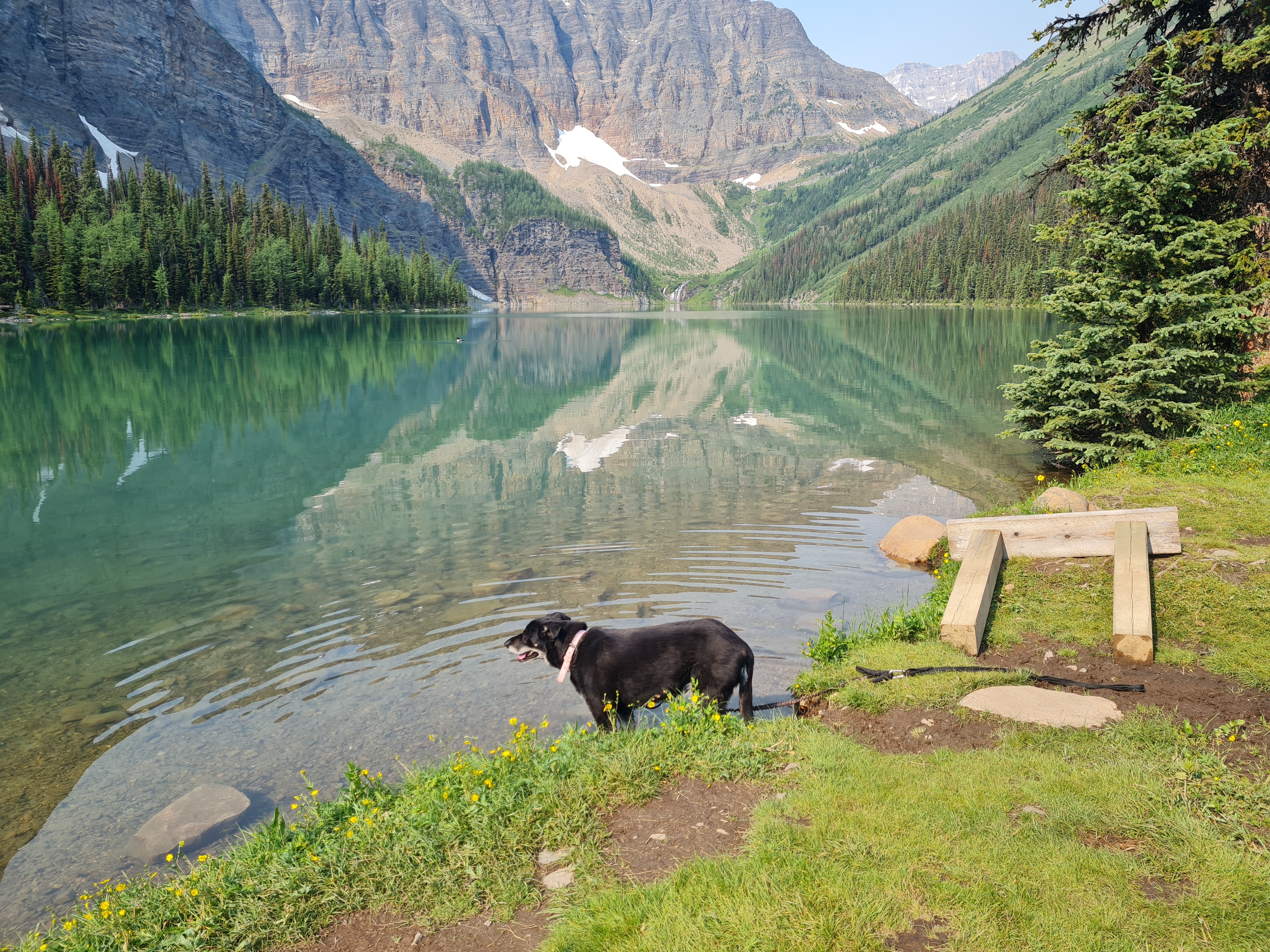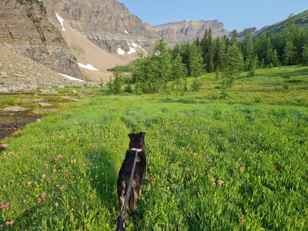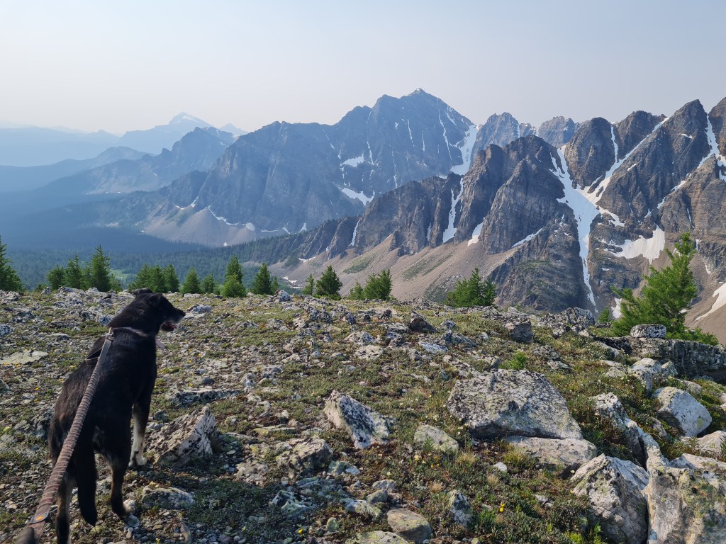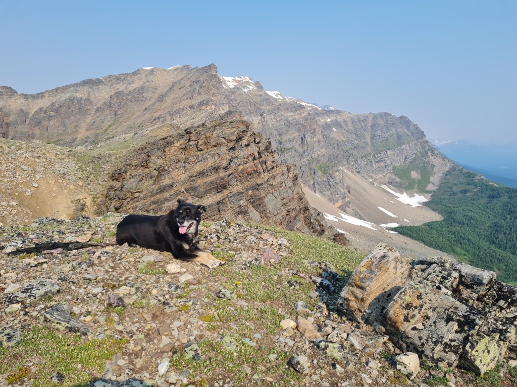 Kona on the East Summit of Panorama Ridge above Taylor Lake at 9:30 am to beat the heat in mid-July.