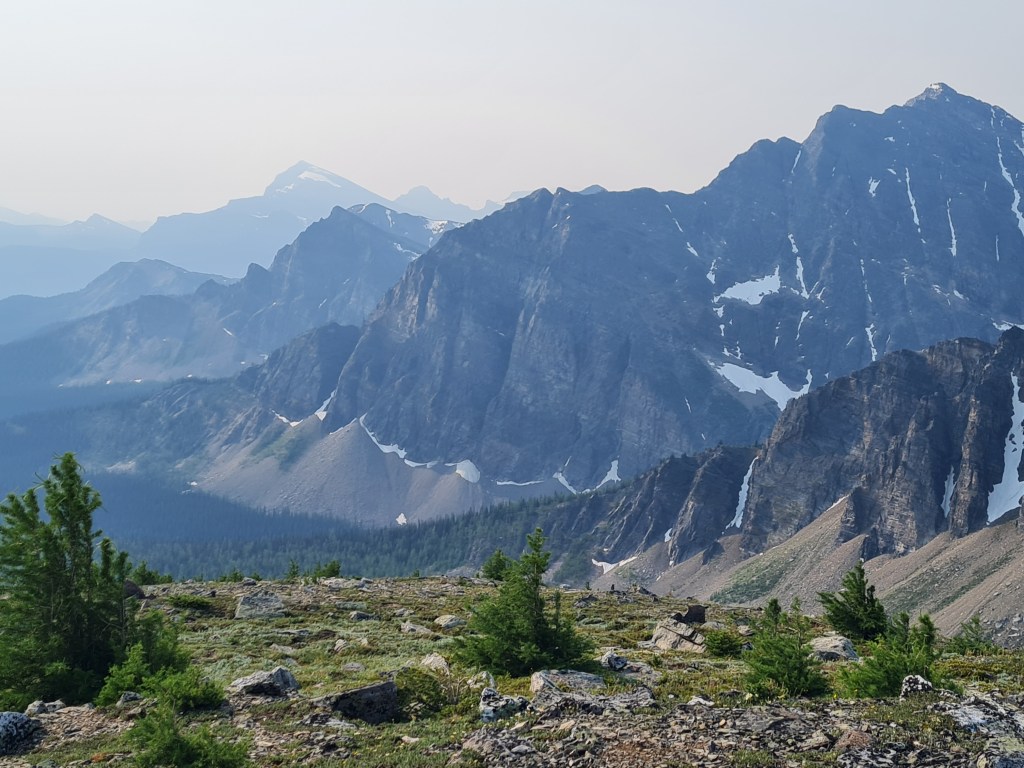 View back toward Taylor Lake and meadows with Storm Mountain just visible in the forest fire smoke (recent Numa Creek fire).
