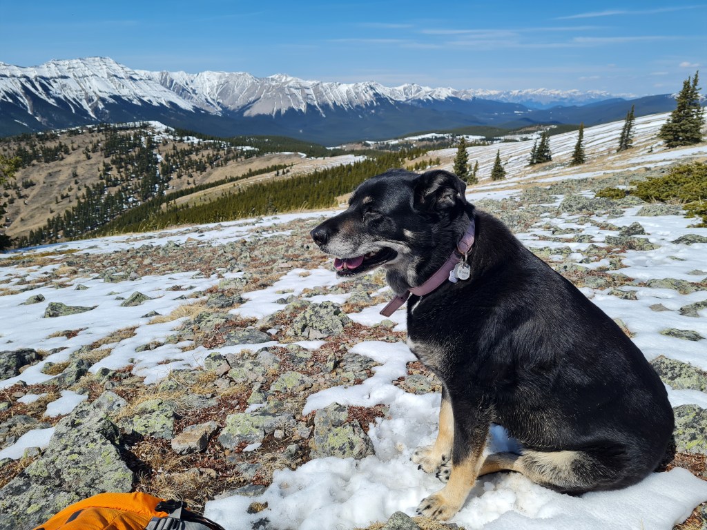 Kona on Powderface Ridge after 8 km hike from winter road closure gate on Hwy 66 in late April.