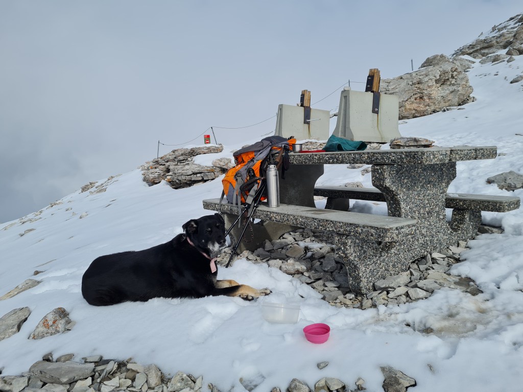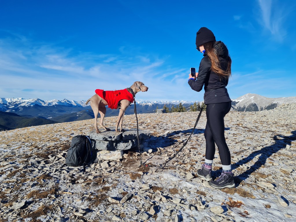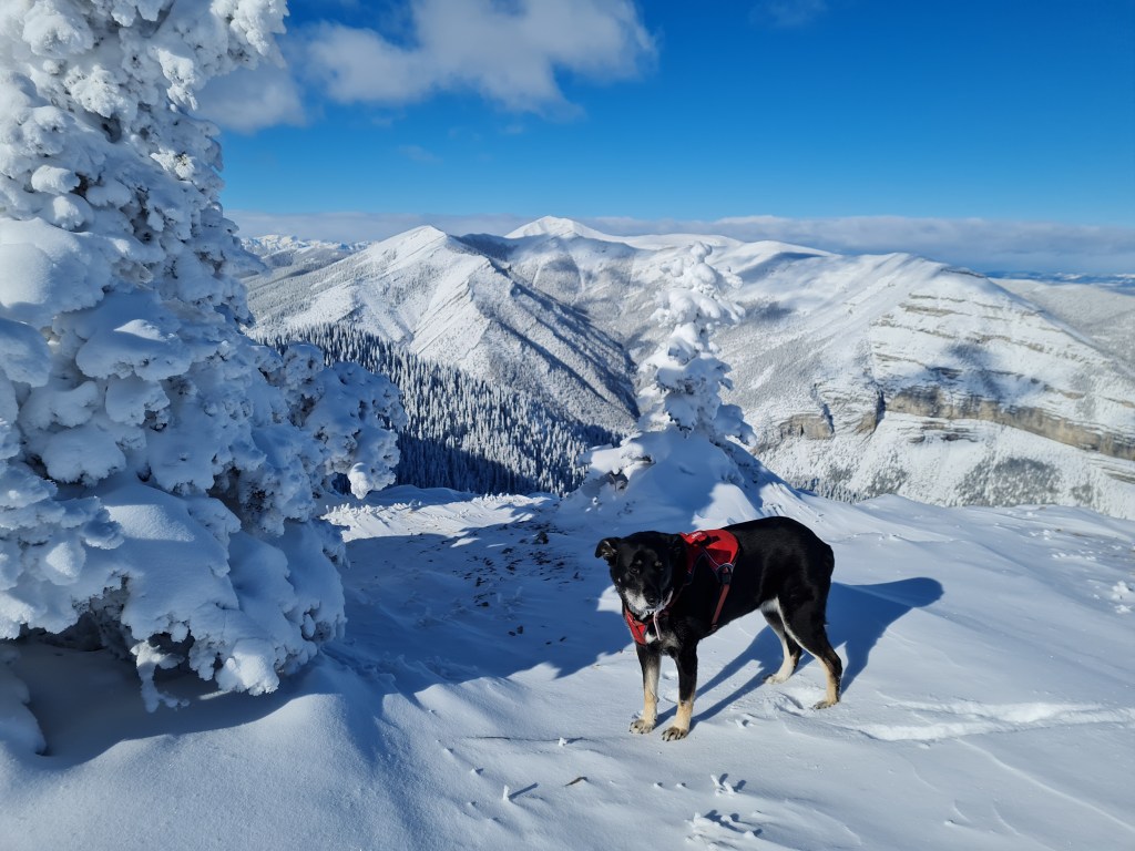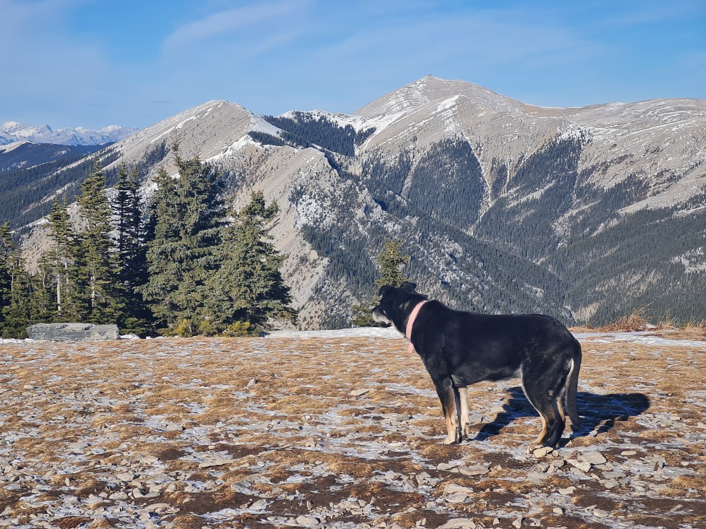 Kona on Prairie Mtn. in mid-June, Moose Mtn. in clouds behind.