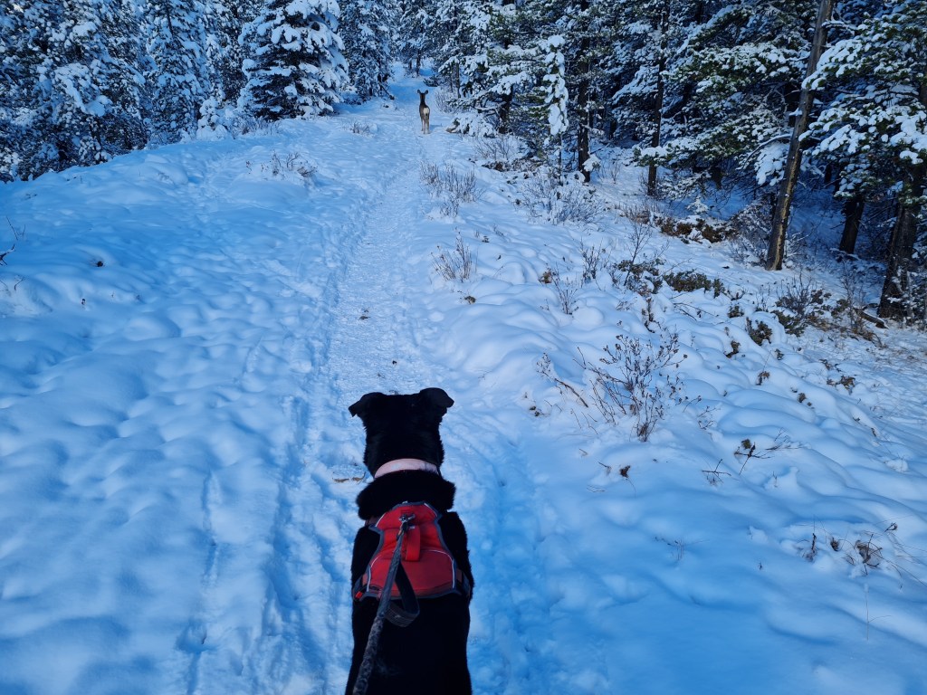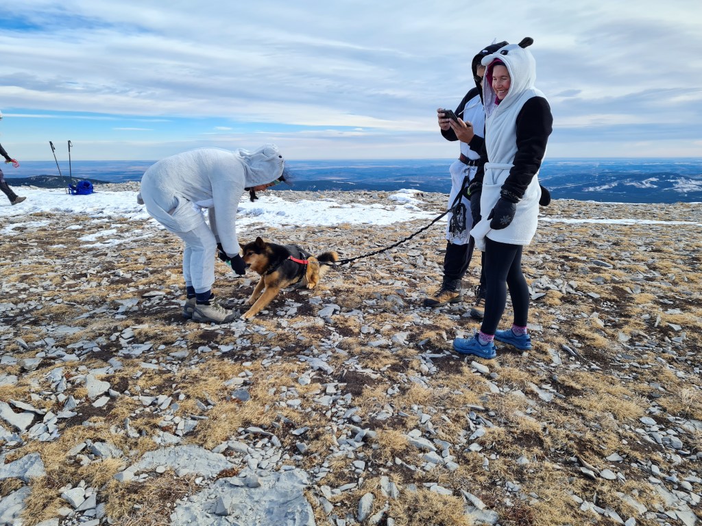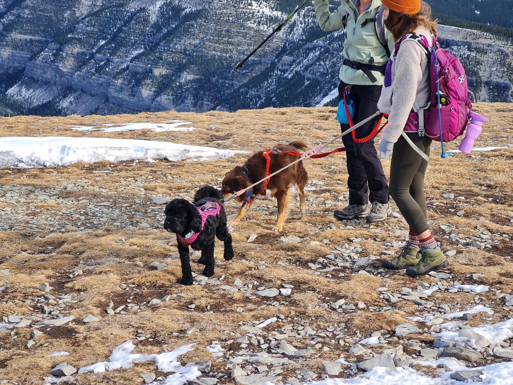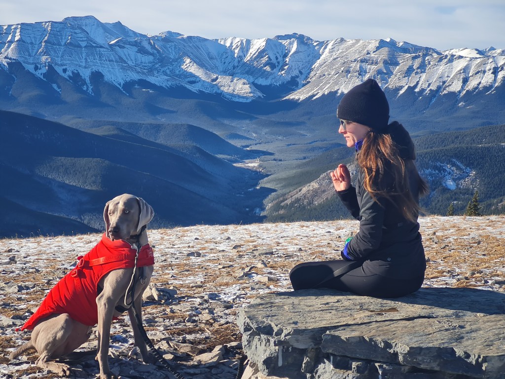 Kona on Prairie Mtn. in mid-June, Moose Mtn. in clouds behind.