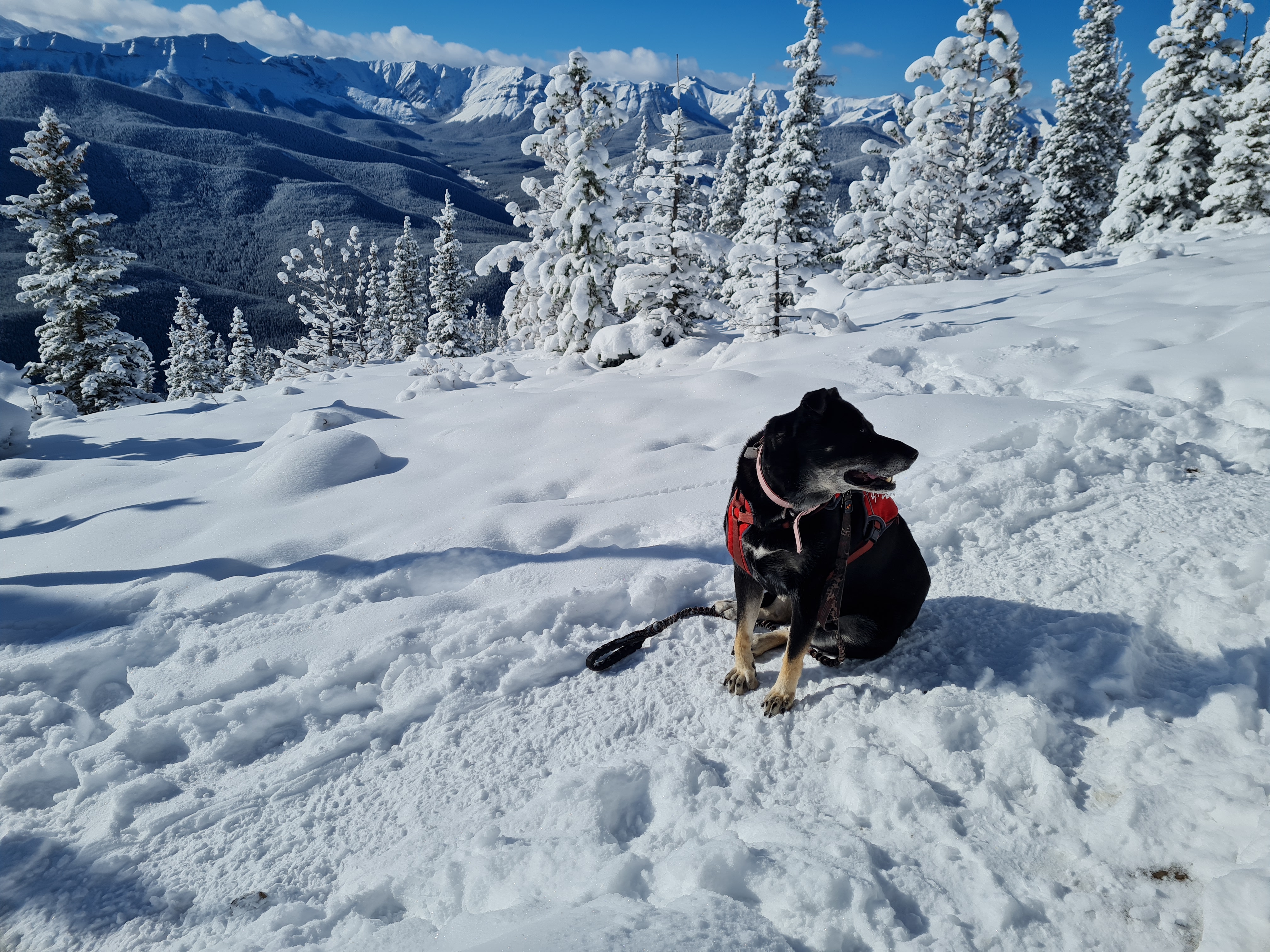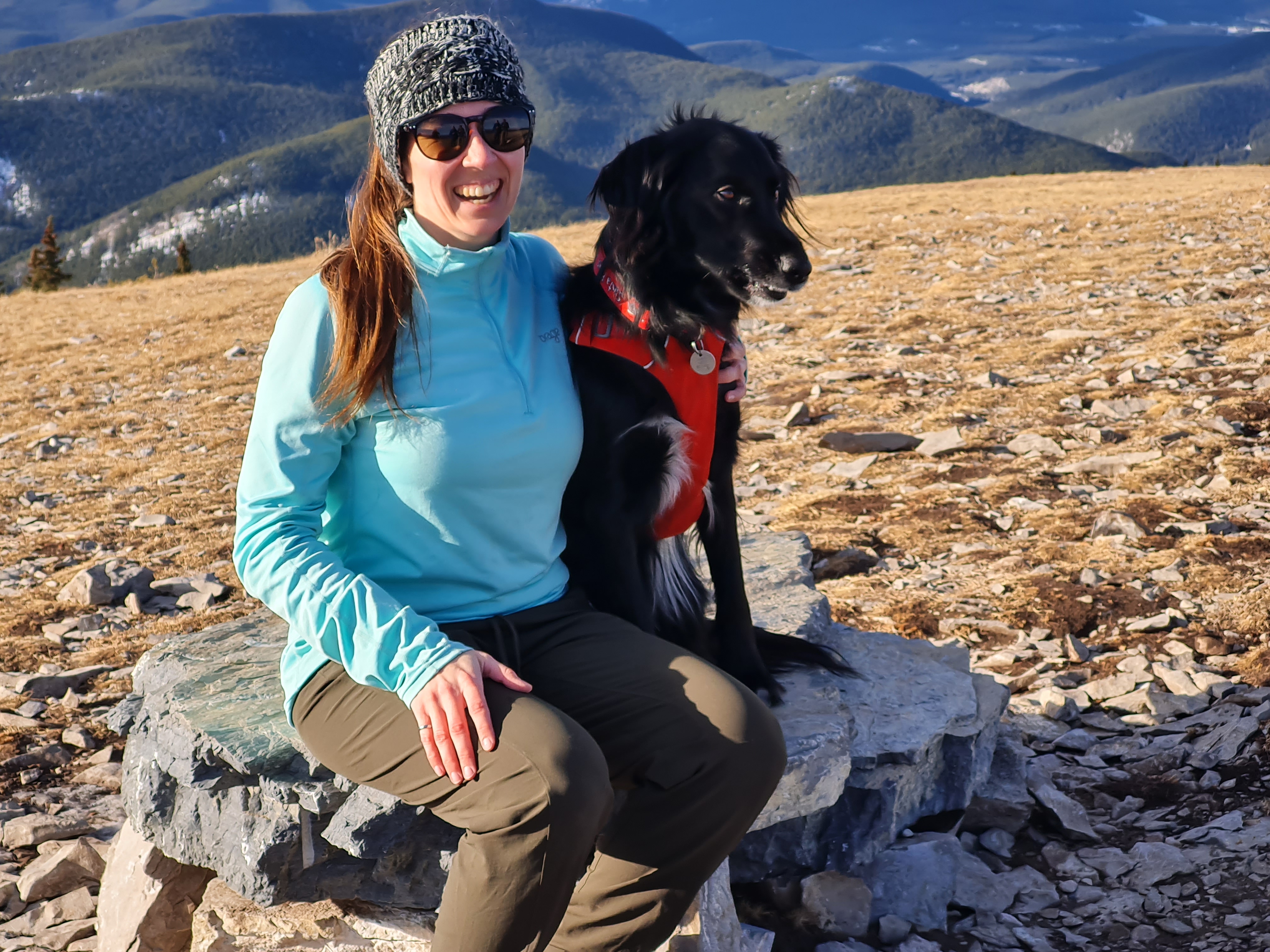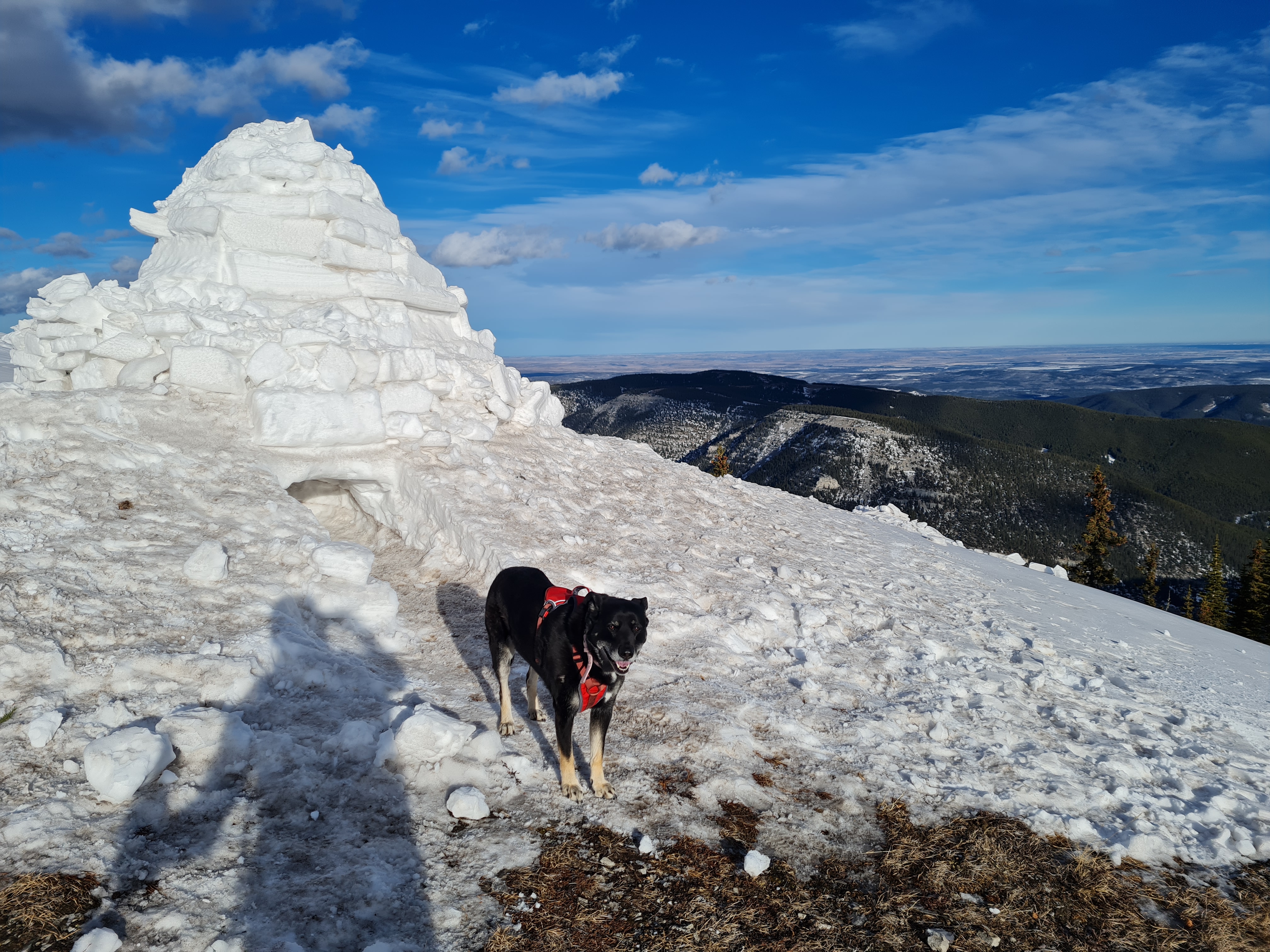Kona on Prairie Mtn. in mid-June, Moose Mtn. in clouds behind.