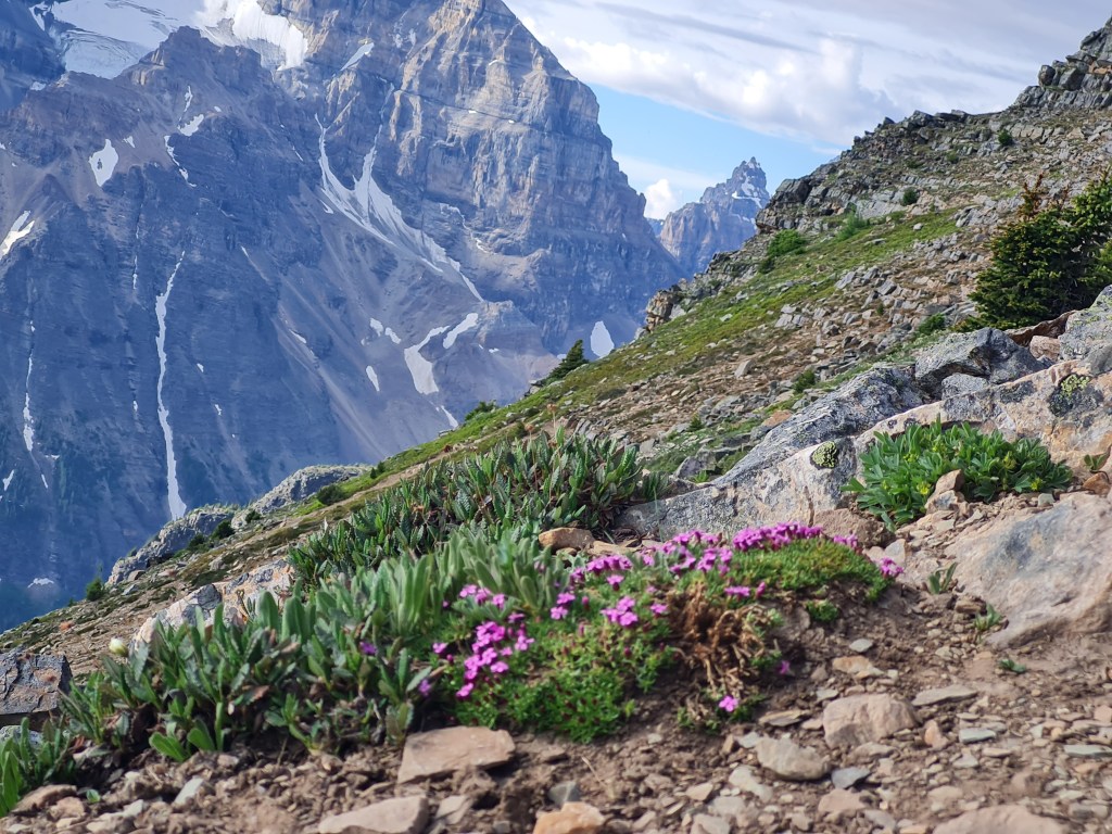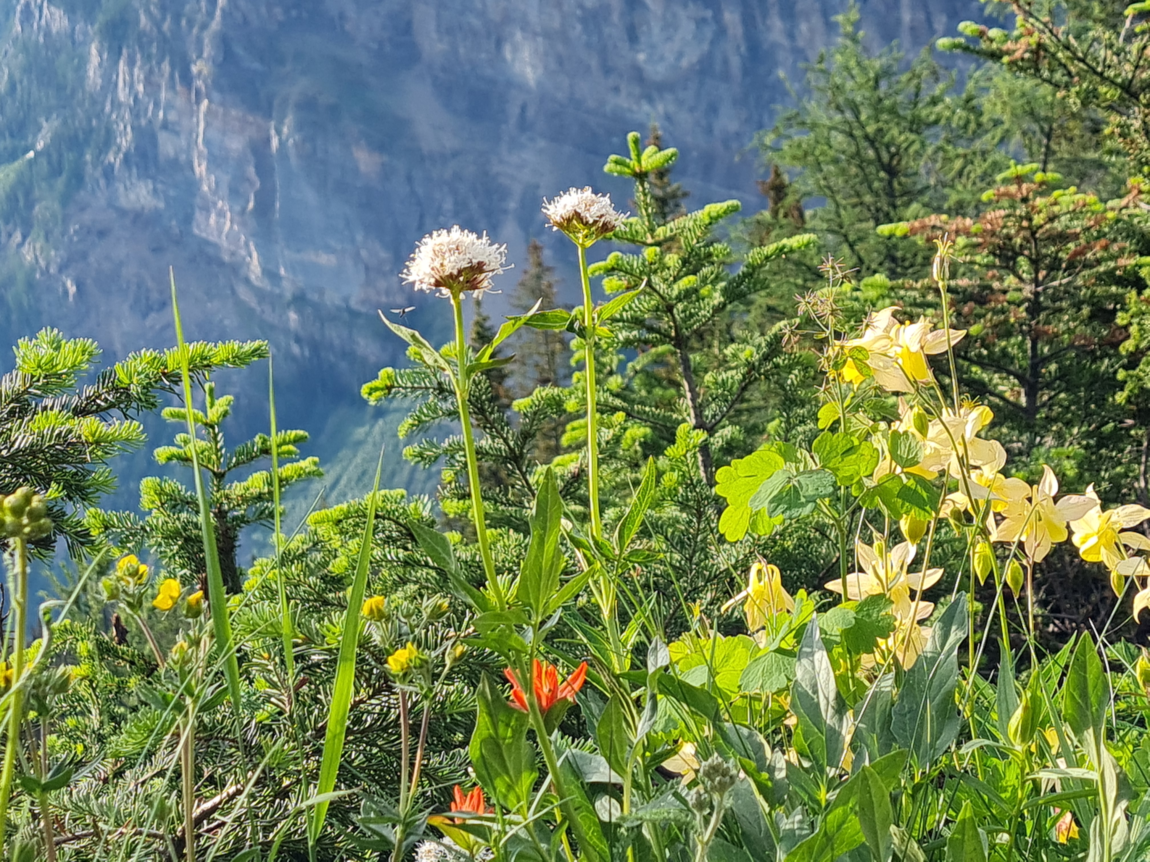 Glacier Lilies (yellow), Paintbrush (red) and Heliotrope / Valerian (white) on trail to Little Beehive above Lake Agnes Teahouse.