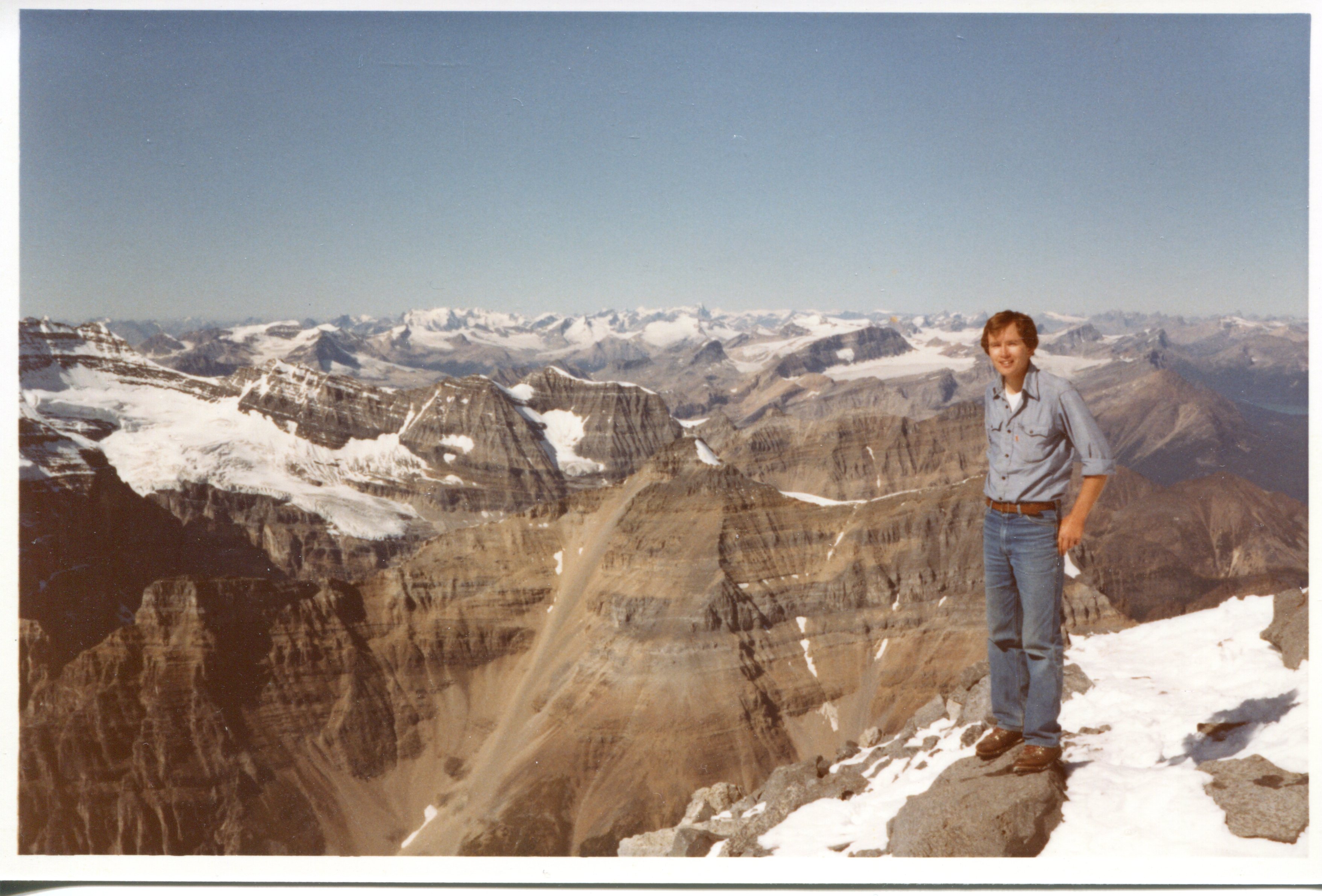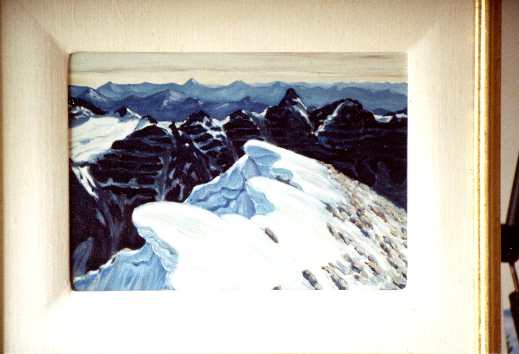Kona’s “Dad” on Mt. Temple in 1982 (survived despite the jeans and cotton shirt) and, below, painting of summit view done later.