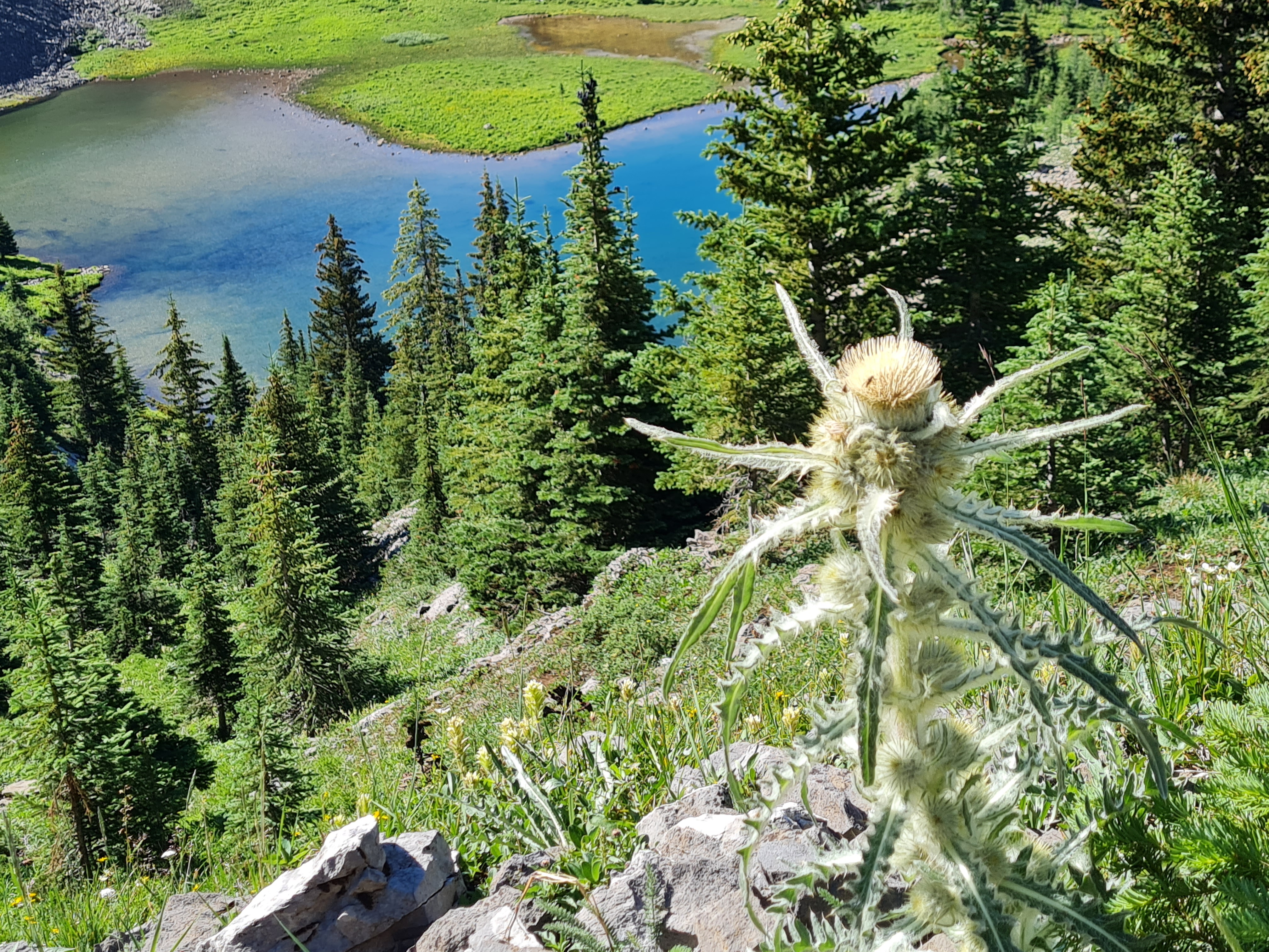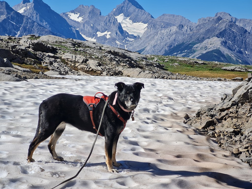 View across the valley at Mt. Sir Douglas, Robertson and others from Three Lakes Valley between Gusty Peak and Mt. Galatea in early August.