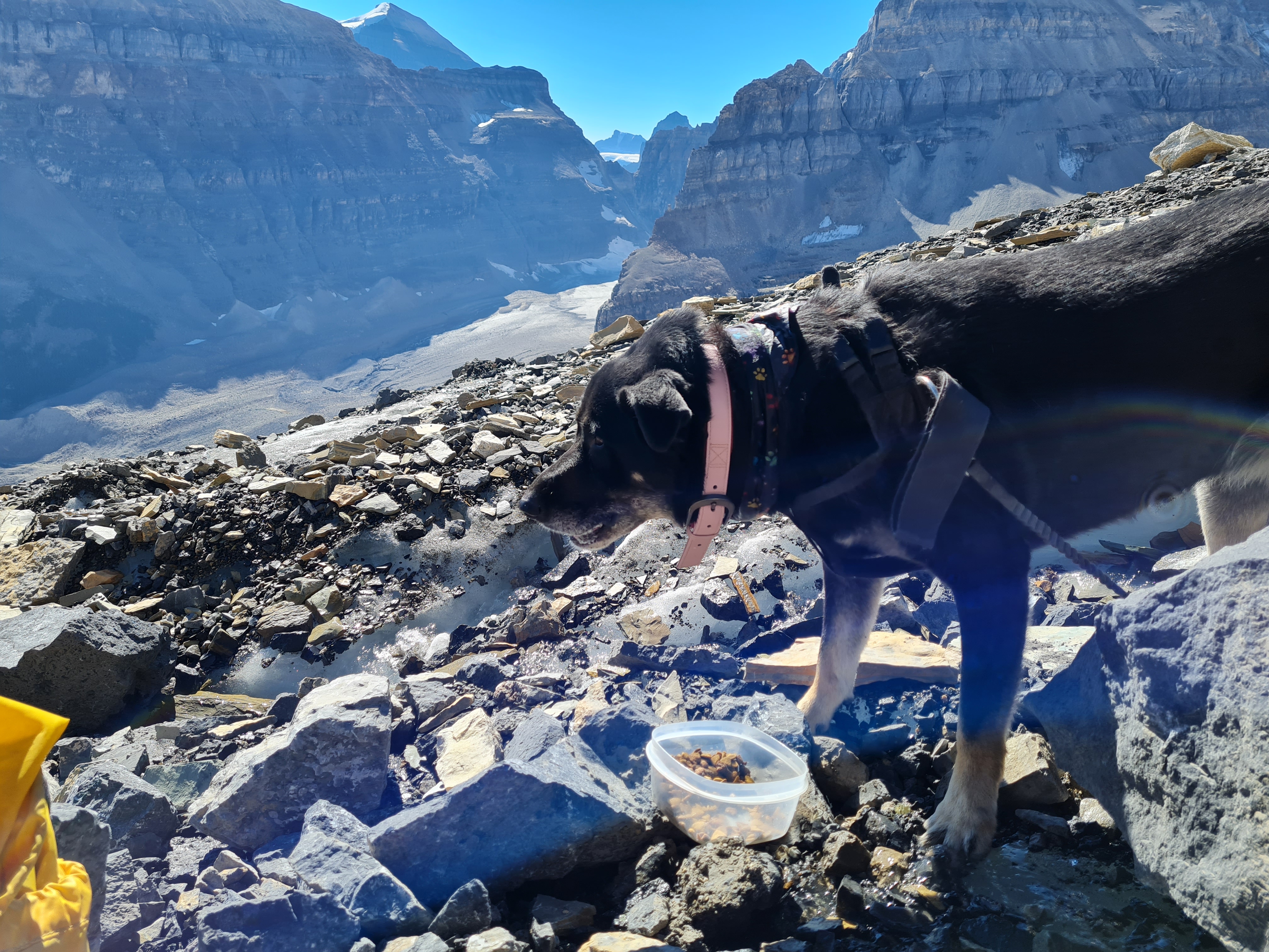 Kona eating her kibbles at a cool spot on the scree covered glacier with 30C+ temperatures in the valley below. Interesting view of Mount Fay in the gap across three valleys (Plain of Six Glaciers, Paradise, and Ten Peaks. Mount Temple looming over shoulder of Aberdeen, and Pinnacle Peak just behind shoulder of The Mitre behind shoulder of Lefroy.