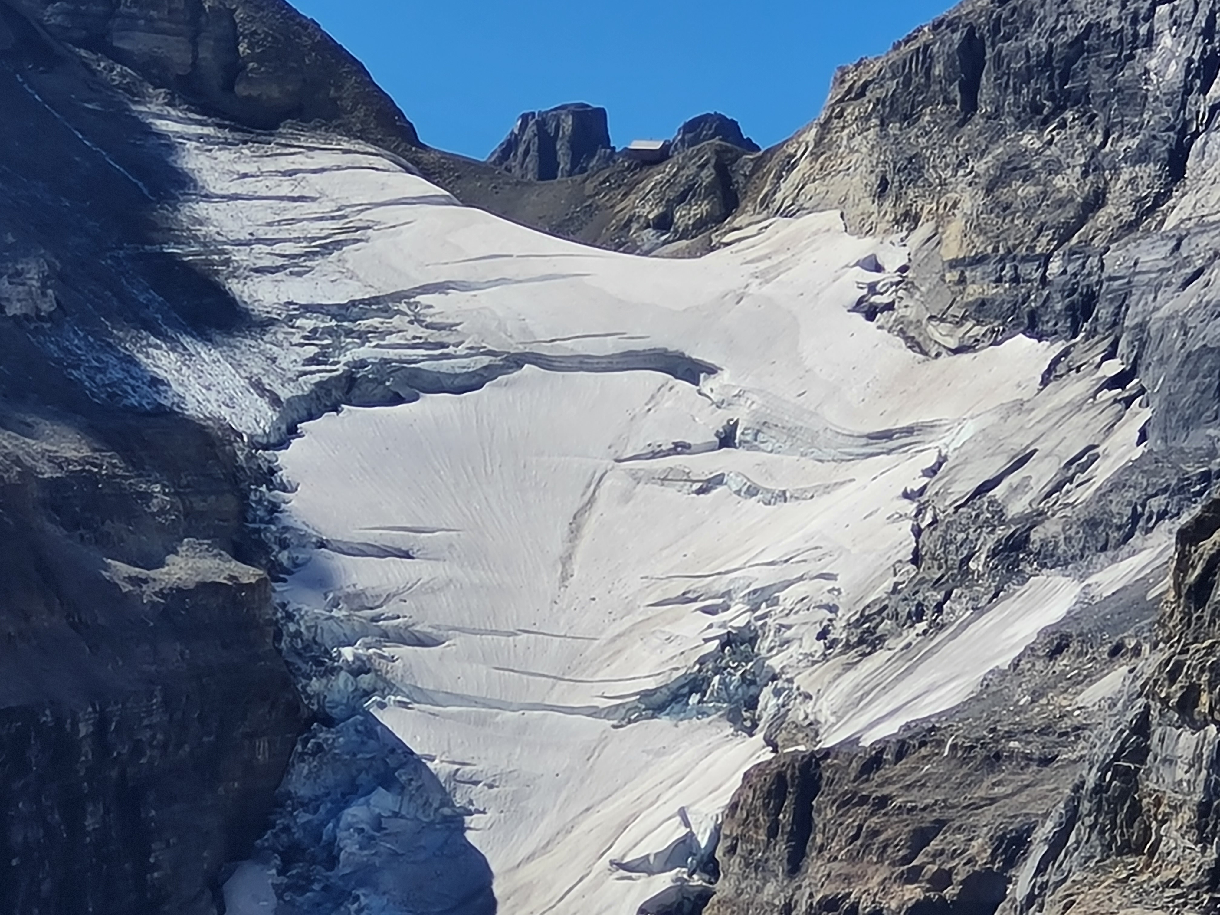 Late summer snow patch to cool off on way to toe of glacier. “The Sickle” ice formation on way to Mount Victoria South summit visible on ridge behind.