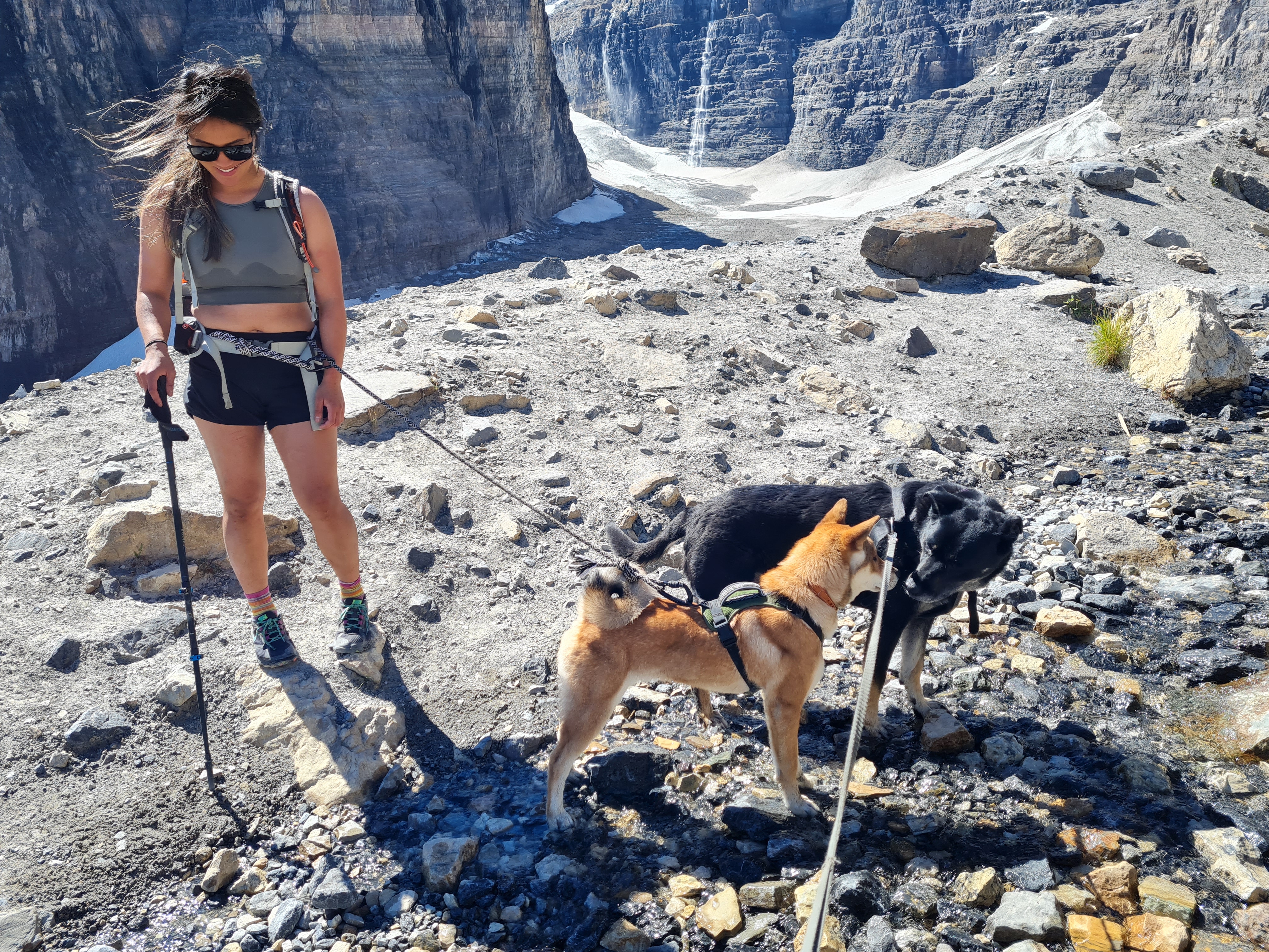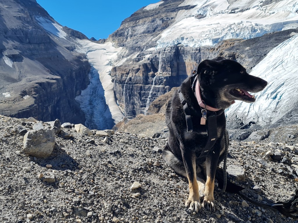 Koji on glacier viewpoint trail from Plain of Six Glaciers Teahouse. “The Deathtrap” approach to Abbott Pass behind.