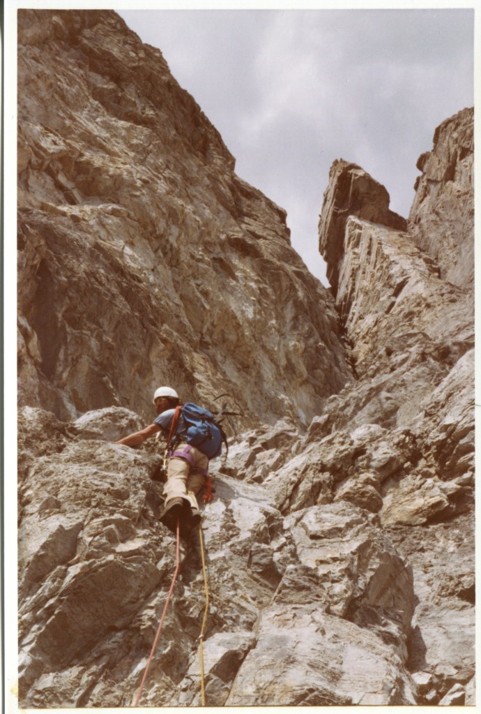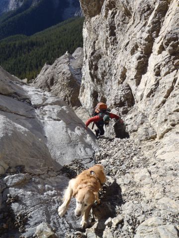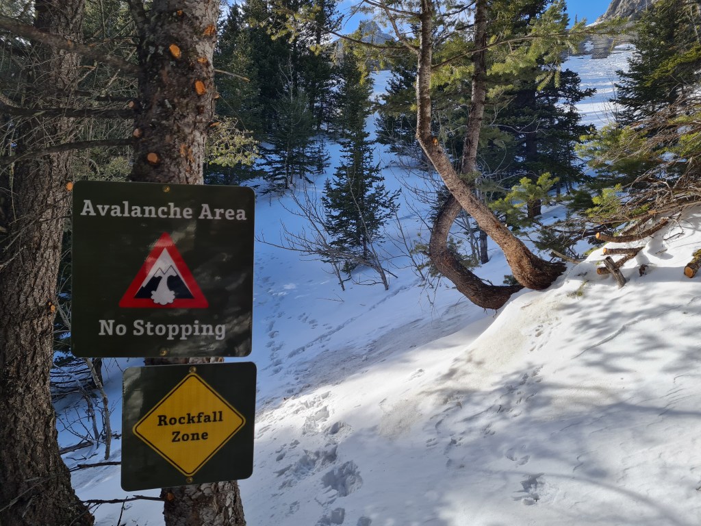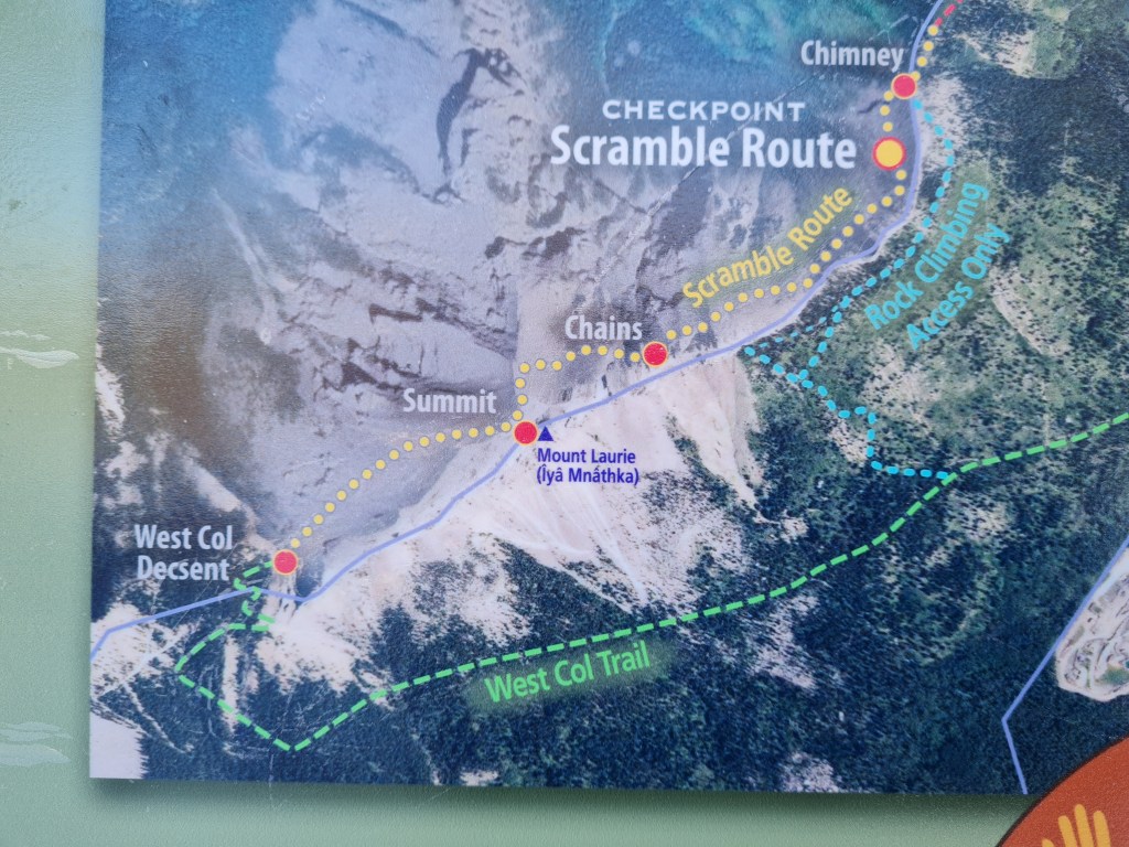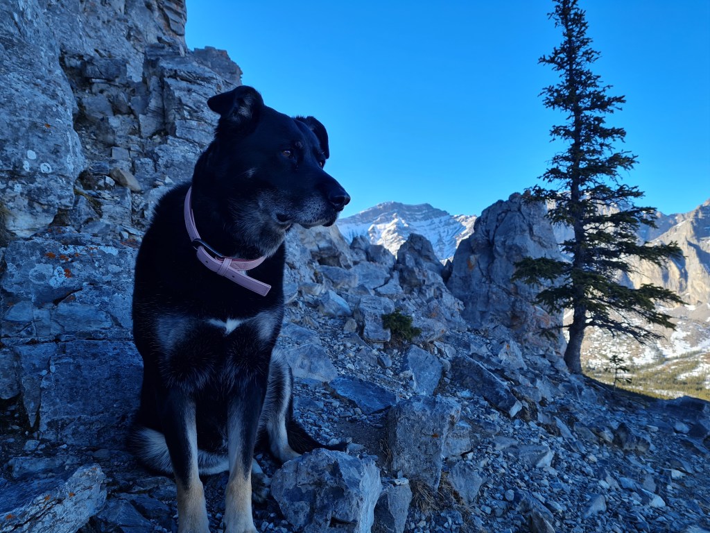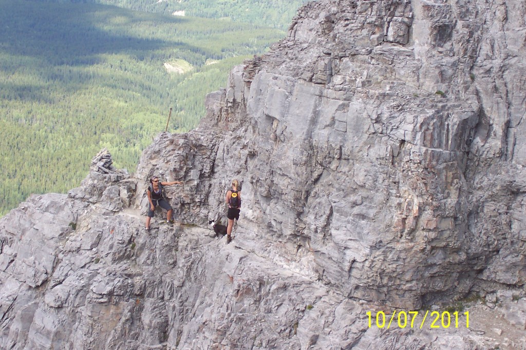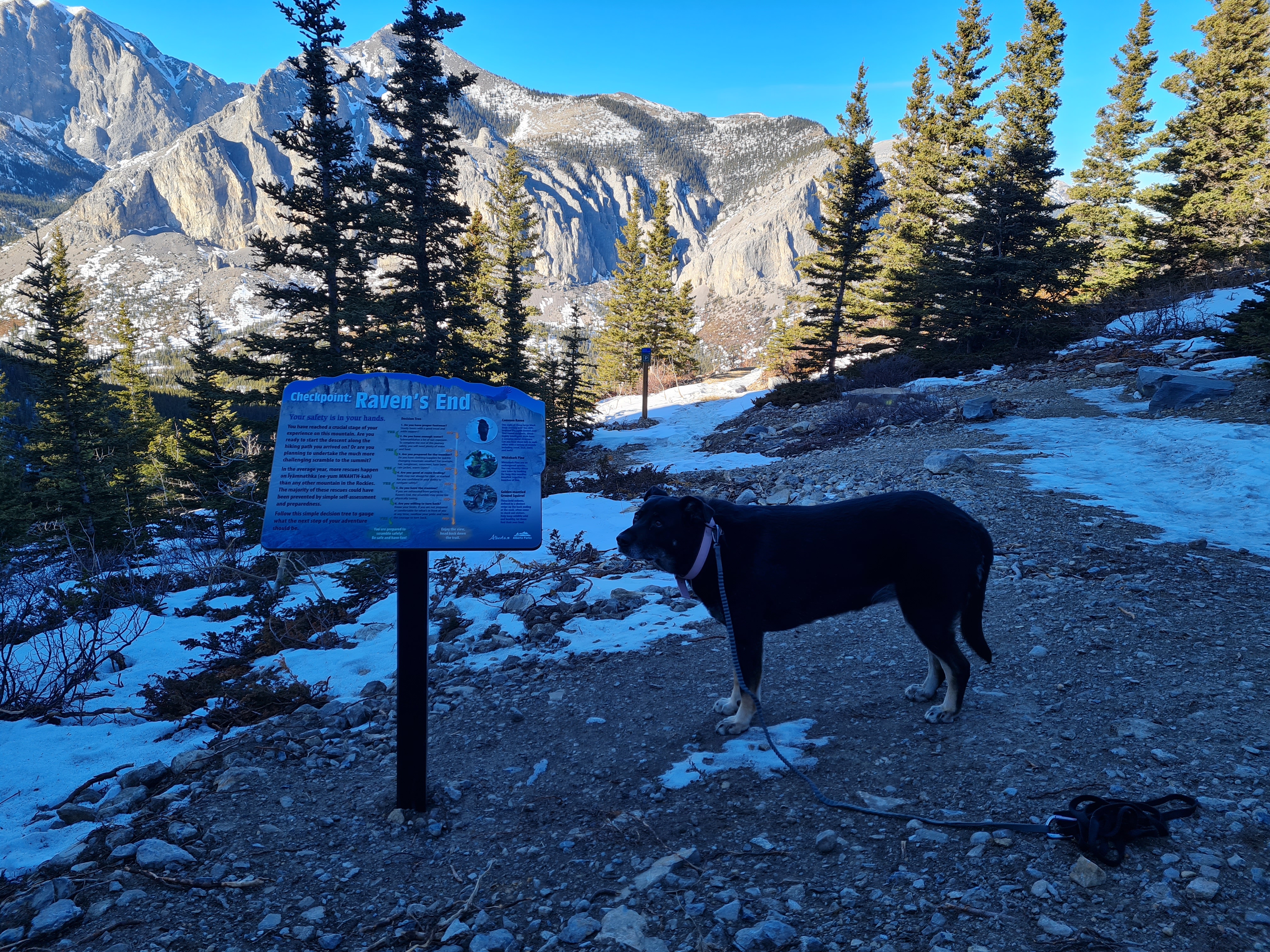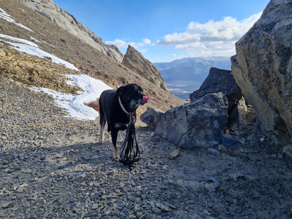 Windy mid-February day at col between Yamnuska and Goat Mountain after following the new scrambler’s descent route (most of the way, lost trail near end in fresh wind-blown snow)