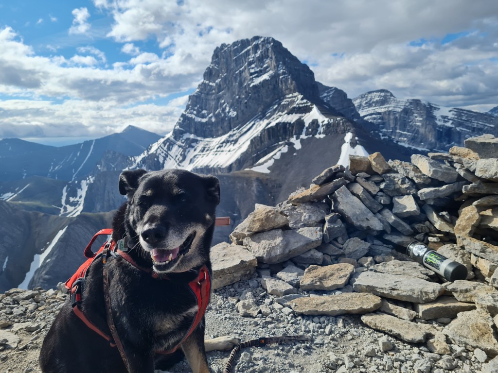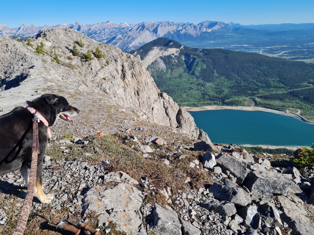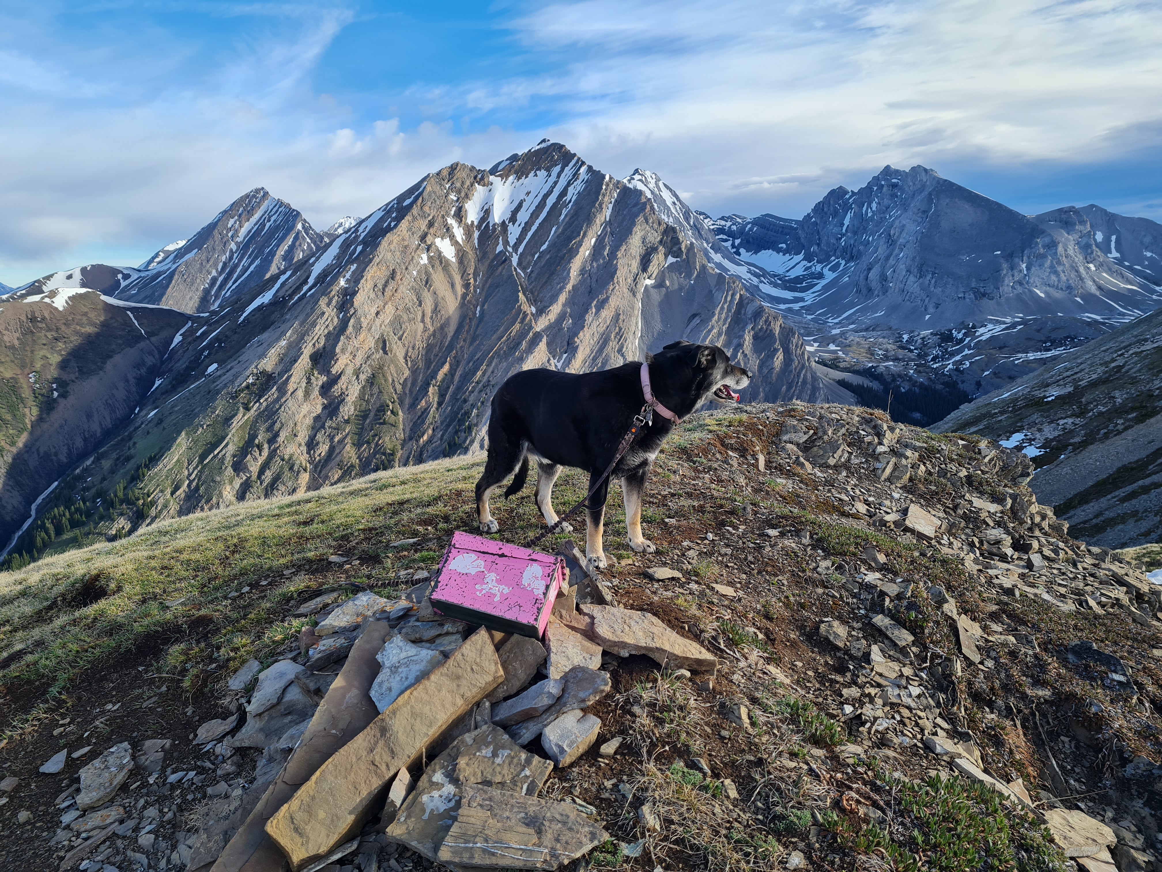 Kona on Wind Tower, early June just before trail closure for Kananaskis G7 Summit. Mount Lougheed Peak 1 behind with Mount Allan at left and Mt. Sparrowhawk at right.