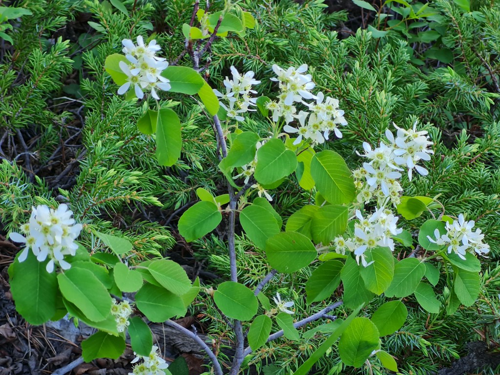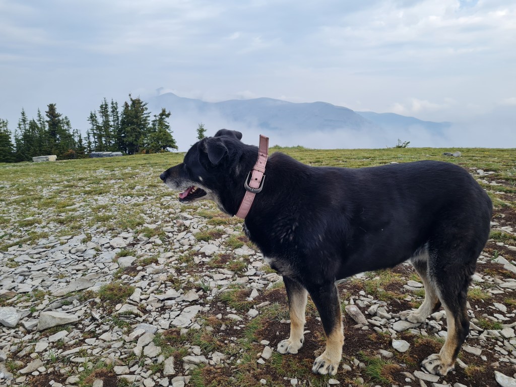 Kona on Prairie Mtn. in mid-June, Moose Mtn. in clouds behind.