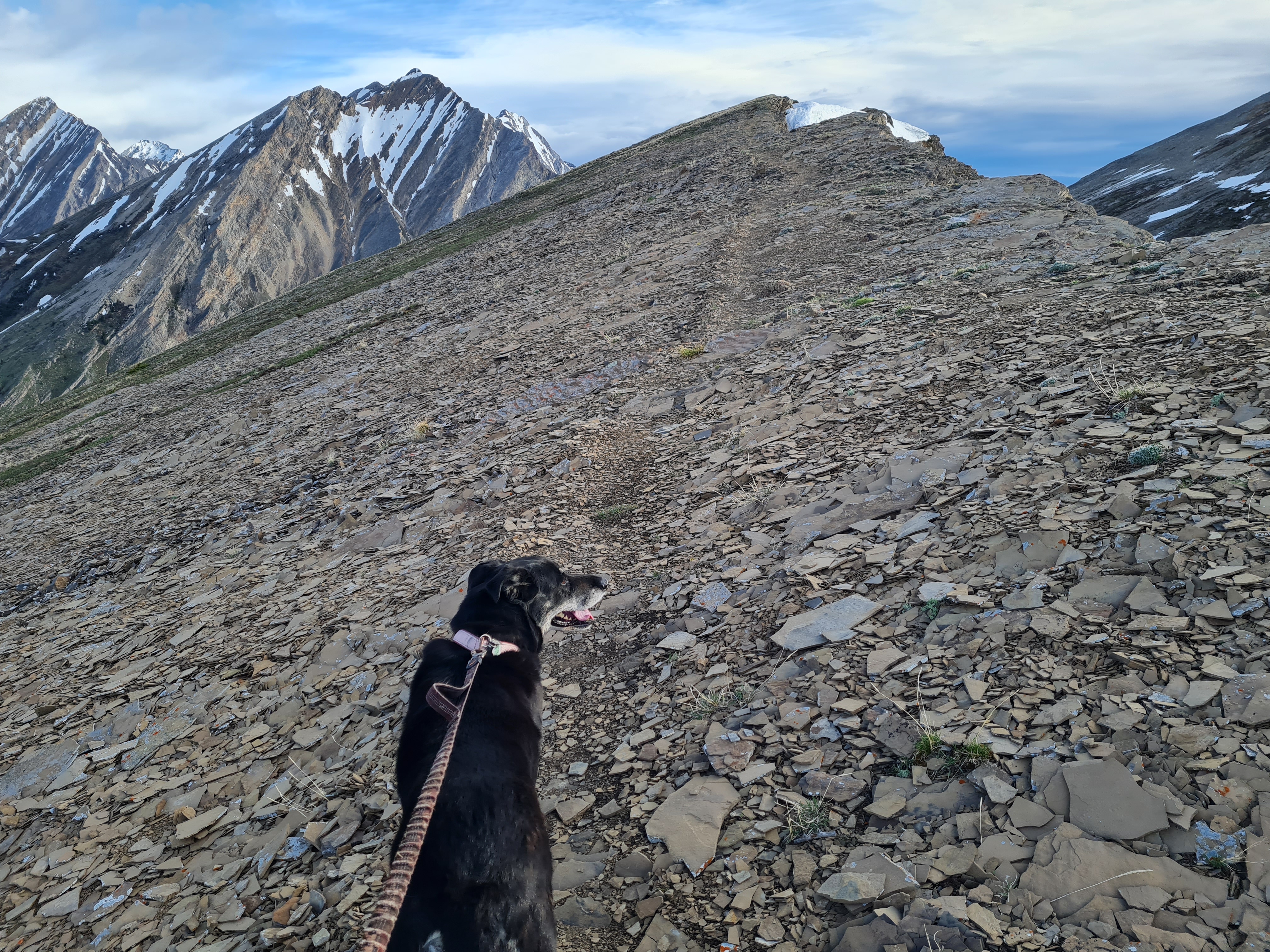 Kona (12 yrs) approaching one of the false summits at end of May, 7:45am, +10C to avoid the expected +30C daytime temperature. No snow on entire trail.