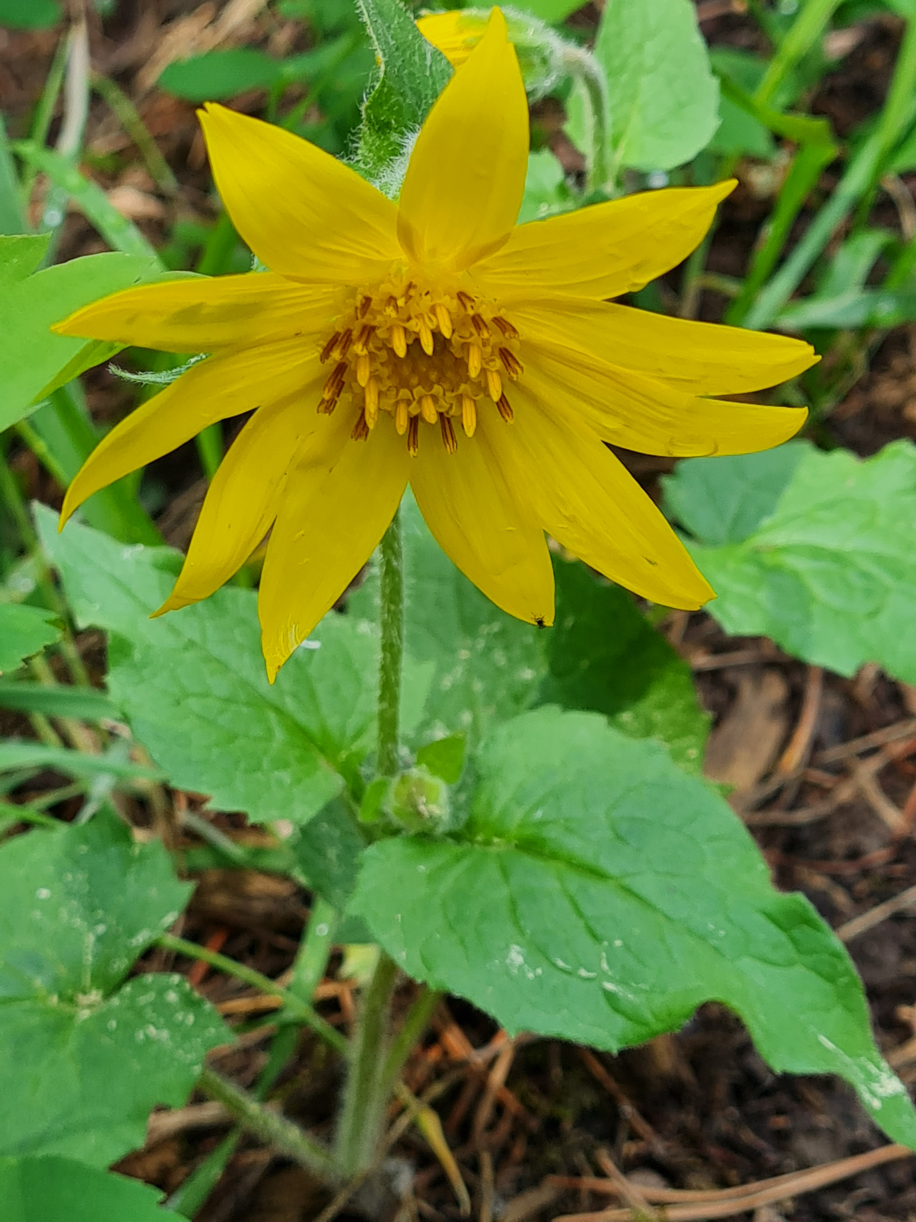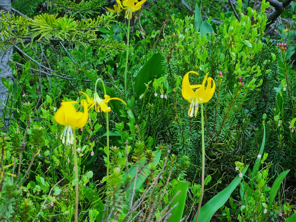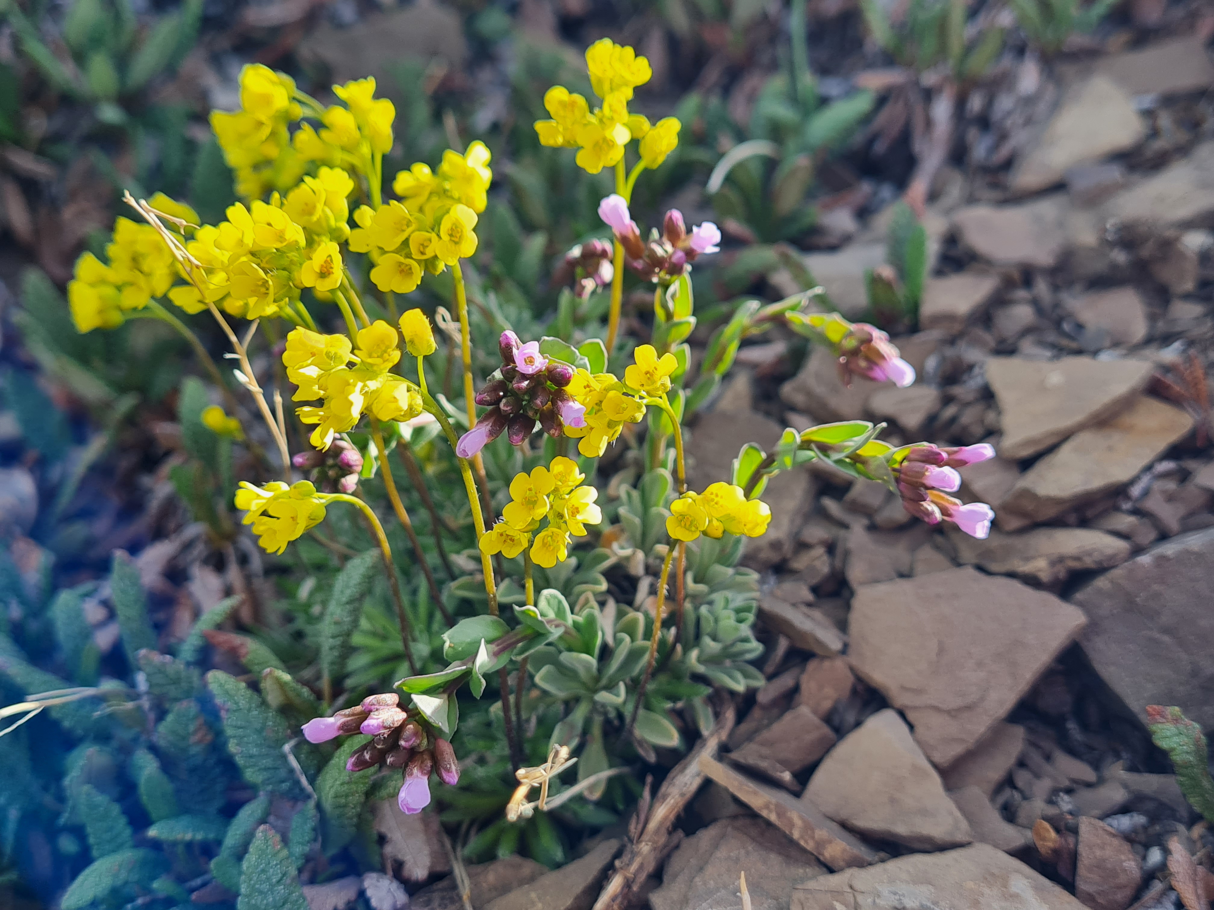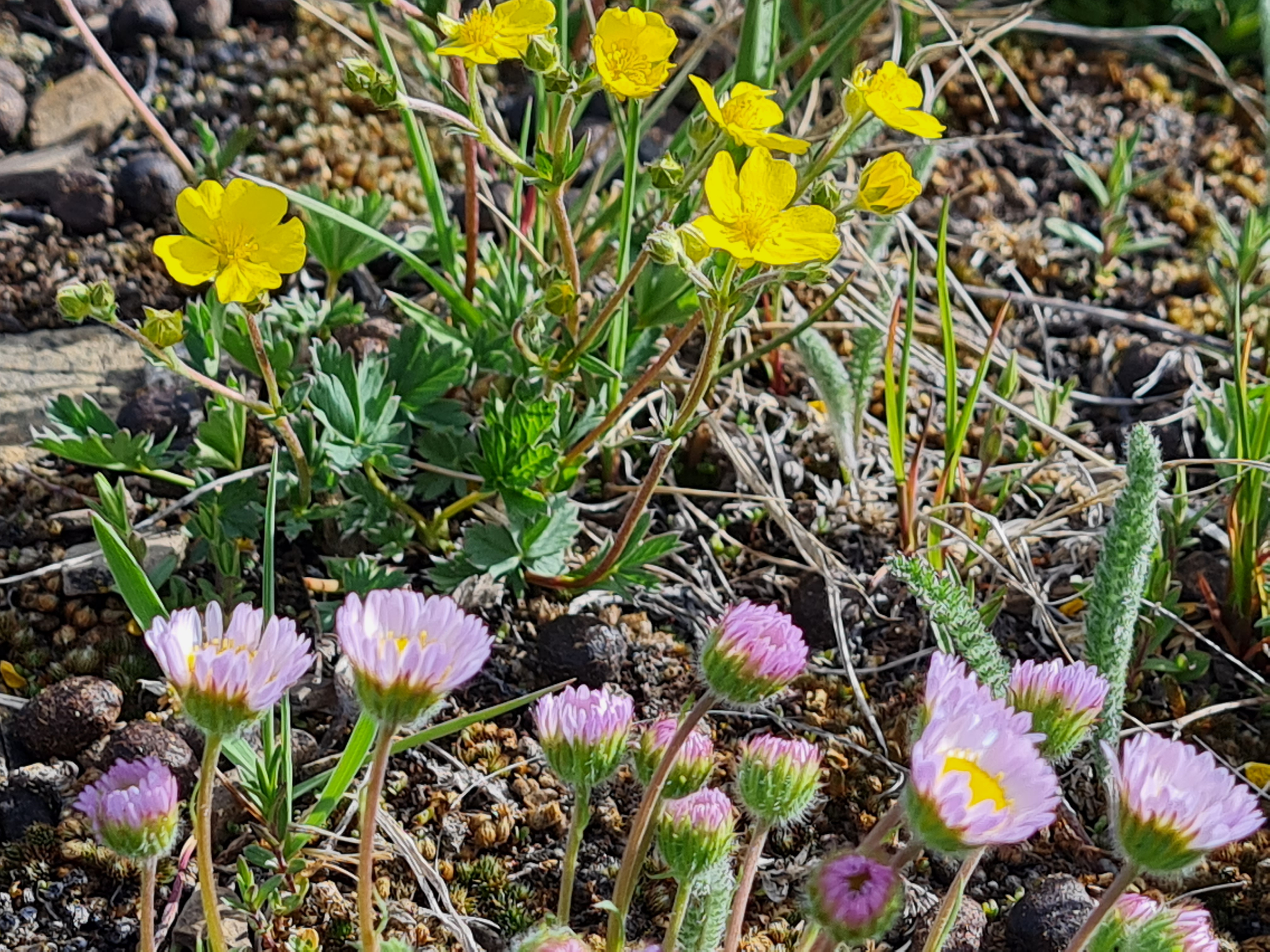 Mountain meadow cinquefoil (Potentilla diversifolis) above, yellow; cutleaf daisy / dwarf mountain fleabane (Erigeron compositus) below.