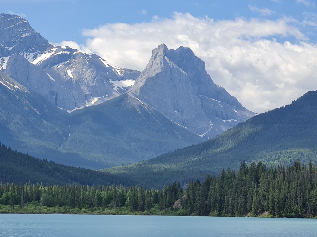 View of steep north face of Wind Tower from Gap Lake, Mt. Lougheed Peak 1 at left.