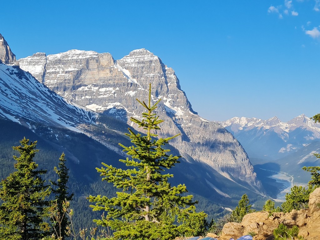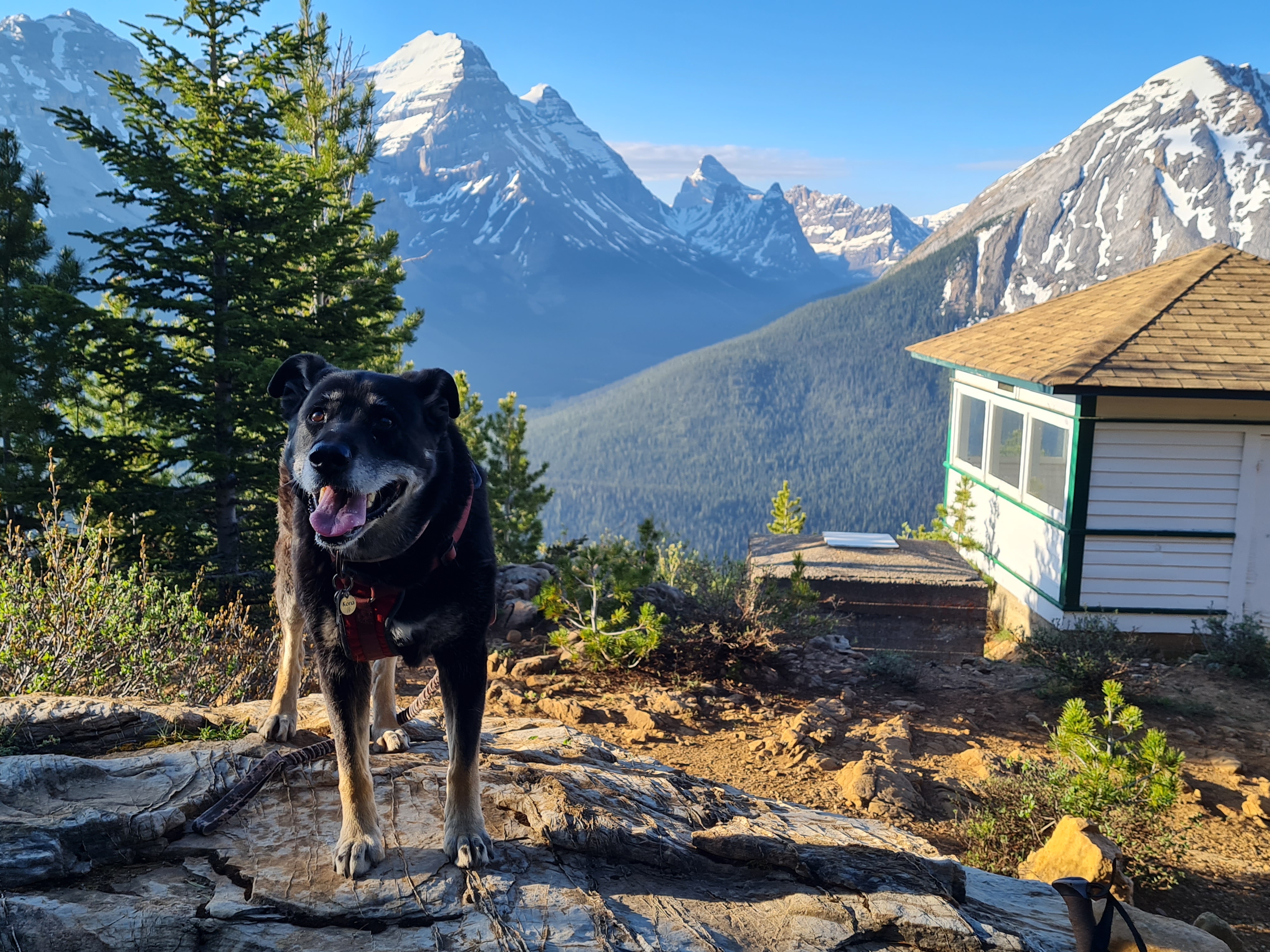 Kona at the lookout in mid-June – view up Lake O’Hara valley with, l. to r.: Mts. Victoria North, Huber, Wiwaxy, Biddle and Schaffer in the distance.