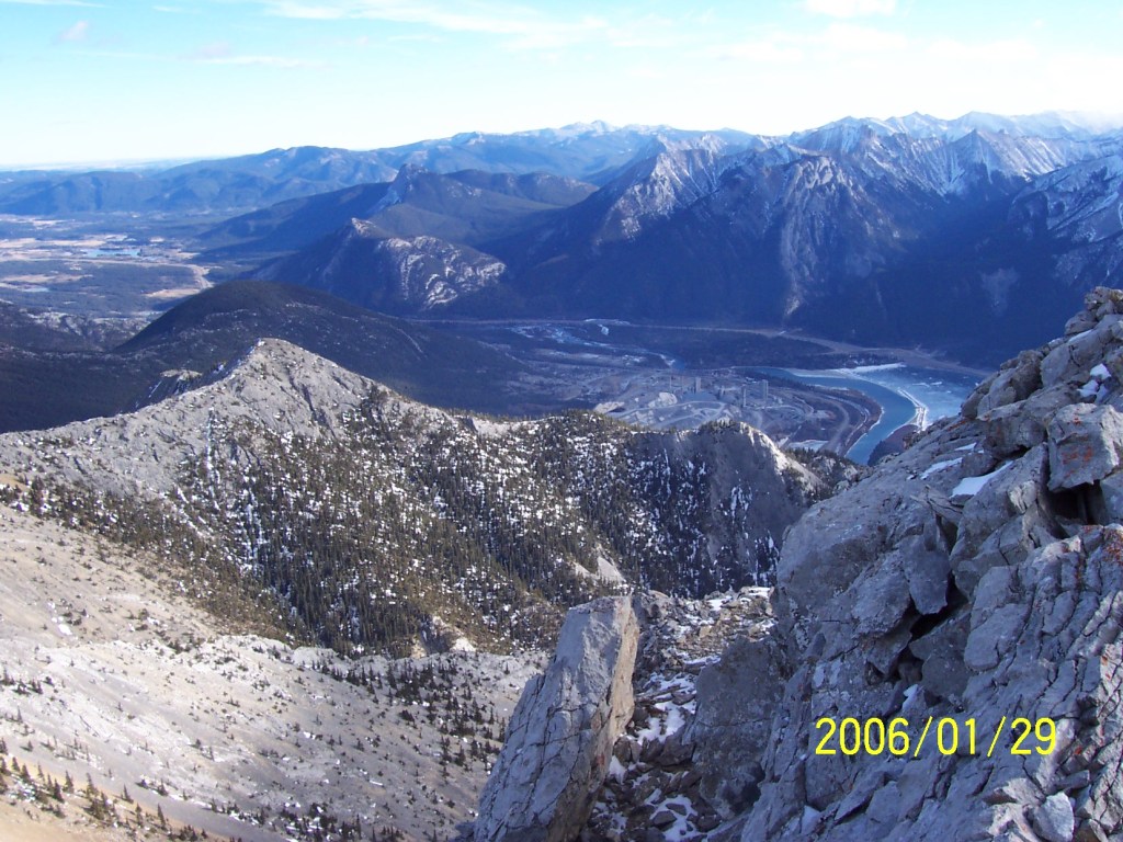 View from Mt. Sparrowhawk across Spray Lakes Reservoir to Mt. Nestor and Old Goat Mountain. Mt. Assiniboine and Lunette Peak on skyline at left.