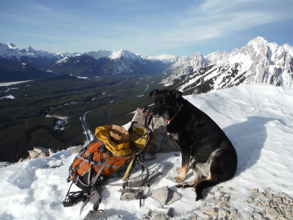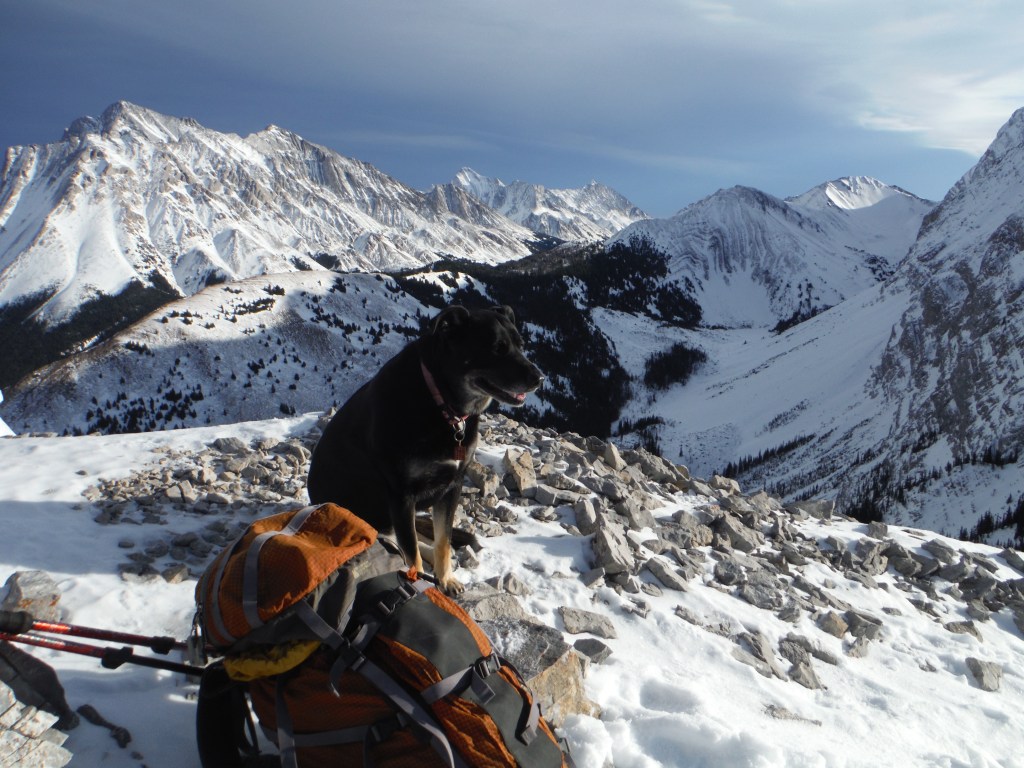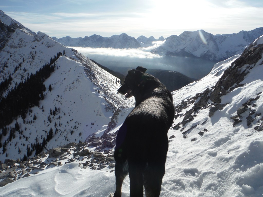 View along Wasootch Ridge to starting point about 5 km away. Mount Lorette and the Lorette-Skogan-McGillivray traverse across the Kananaskis River valley behind. Wasootch Peak at left. Early December just before a snowy and colder weather system is arriving.