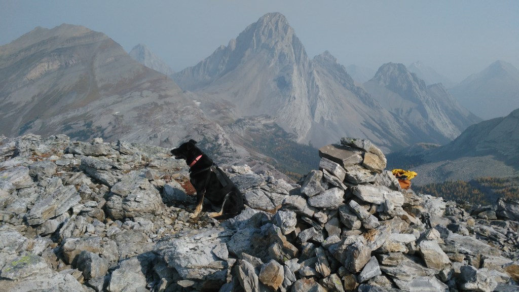 Kona at the window on Mount Tyrwhitt in mid-October. Pocaterra Ridge is obscured by low clouds.