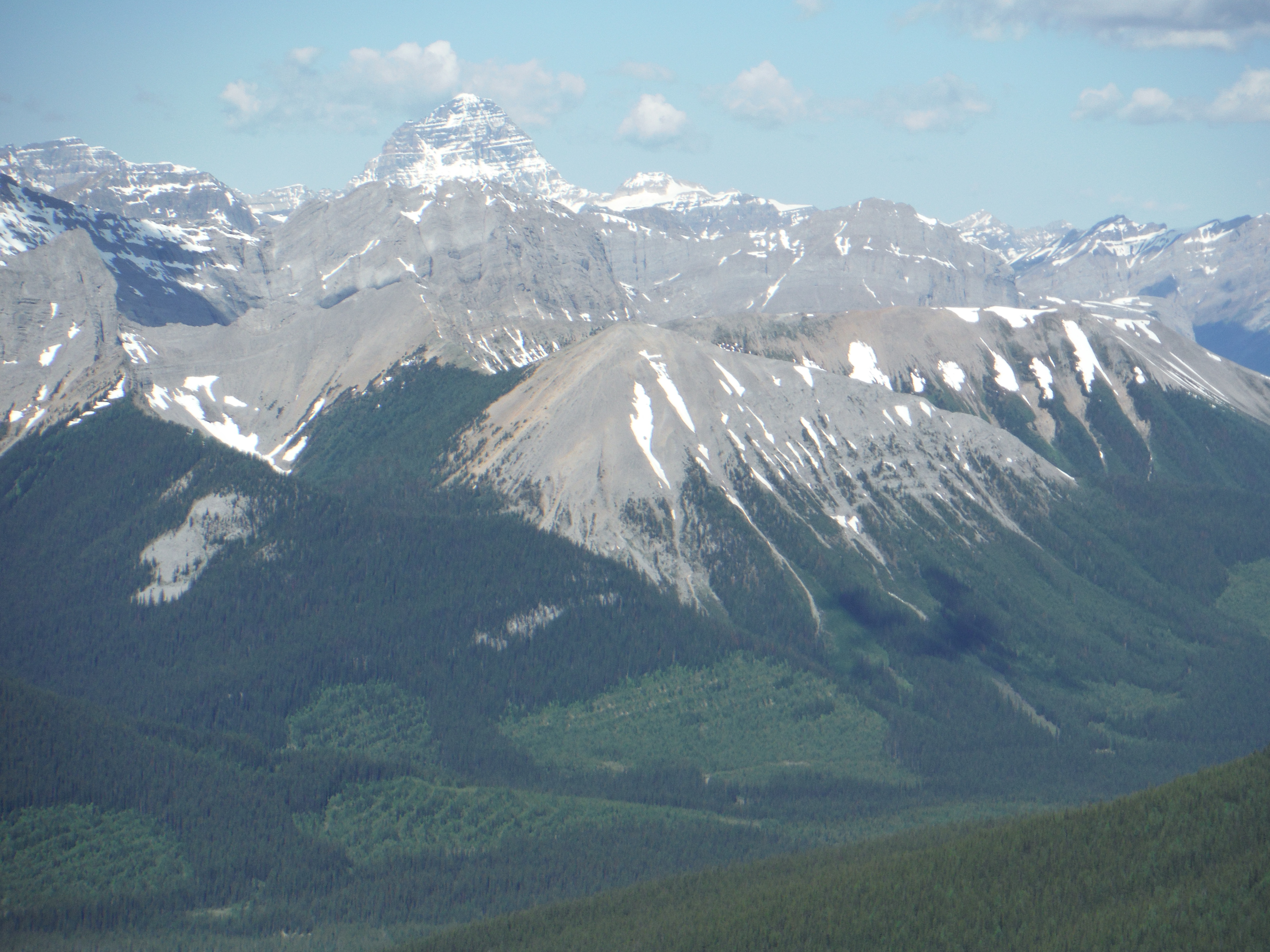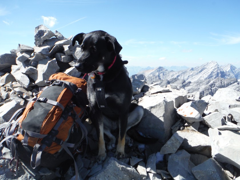 Kona on Mt. Chester (elev. 3054 m) on Canada Day July 1st weekend. Gusty Peak and The Fortress immediately behind. Mt. Kidd at centre background.