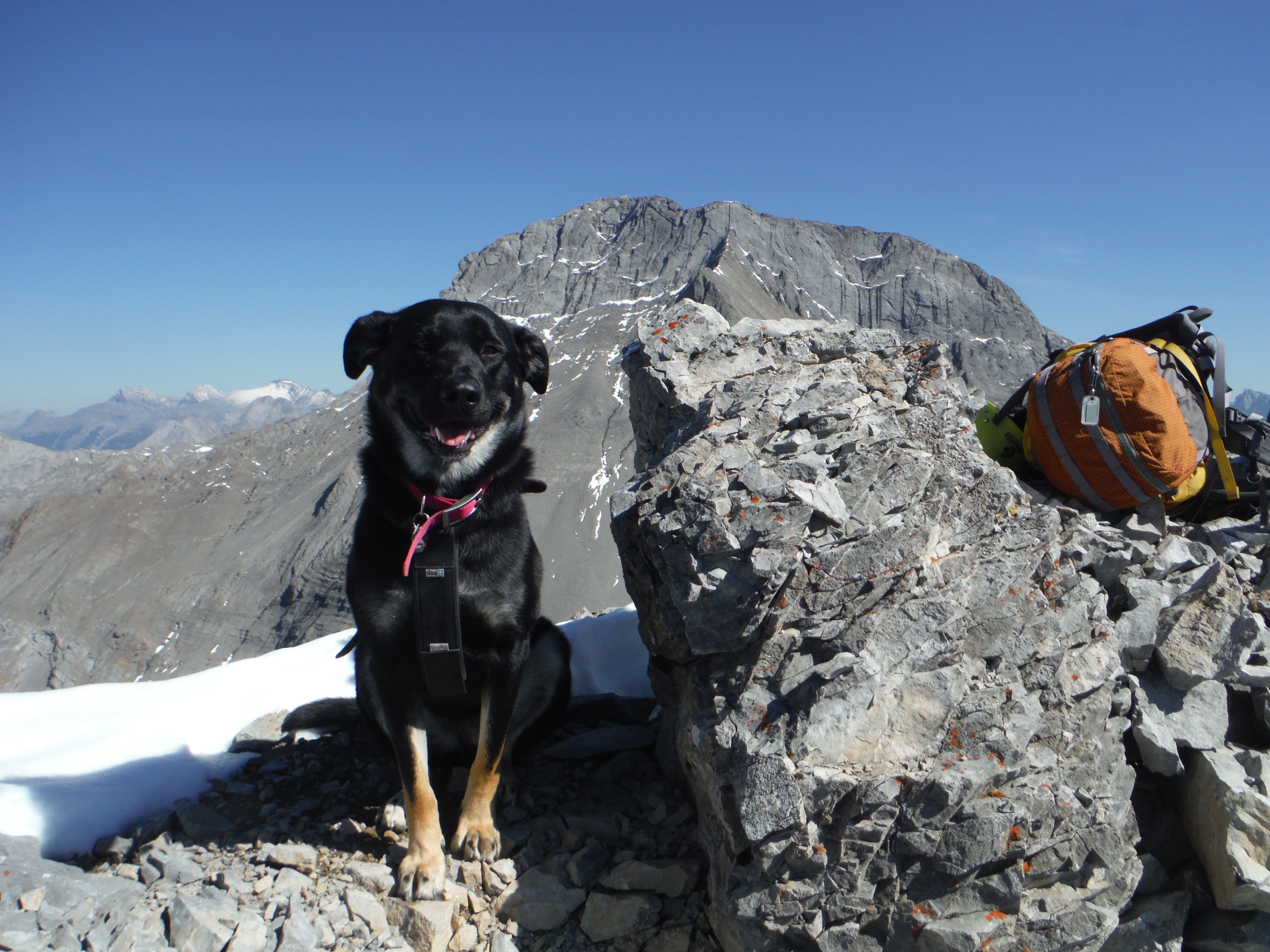 Kona on Burstall Pass Peak in mid-September. Snow Peak, Mt. Birdwood, Pig’s Tail and Commonwealth Peak in smoky haze from NW USA wildfires.