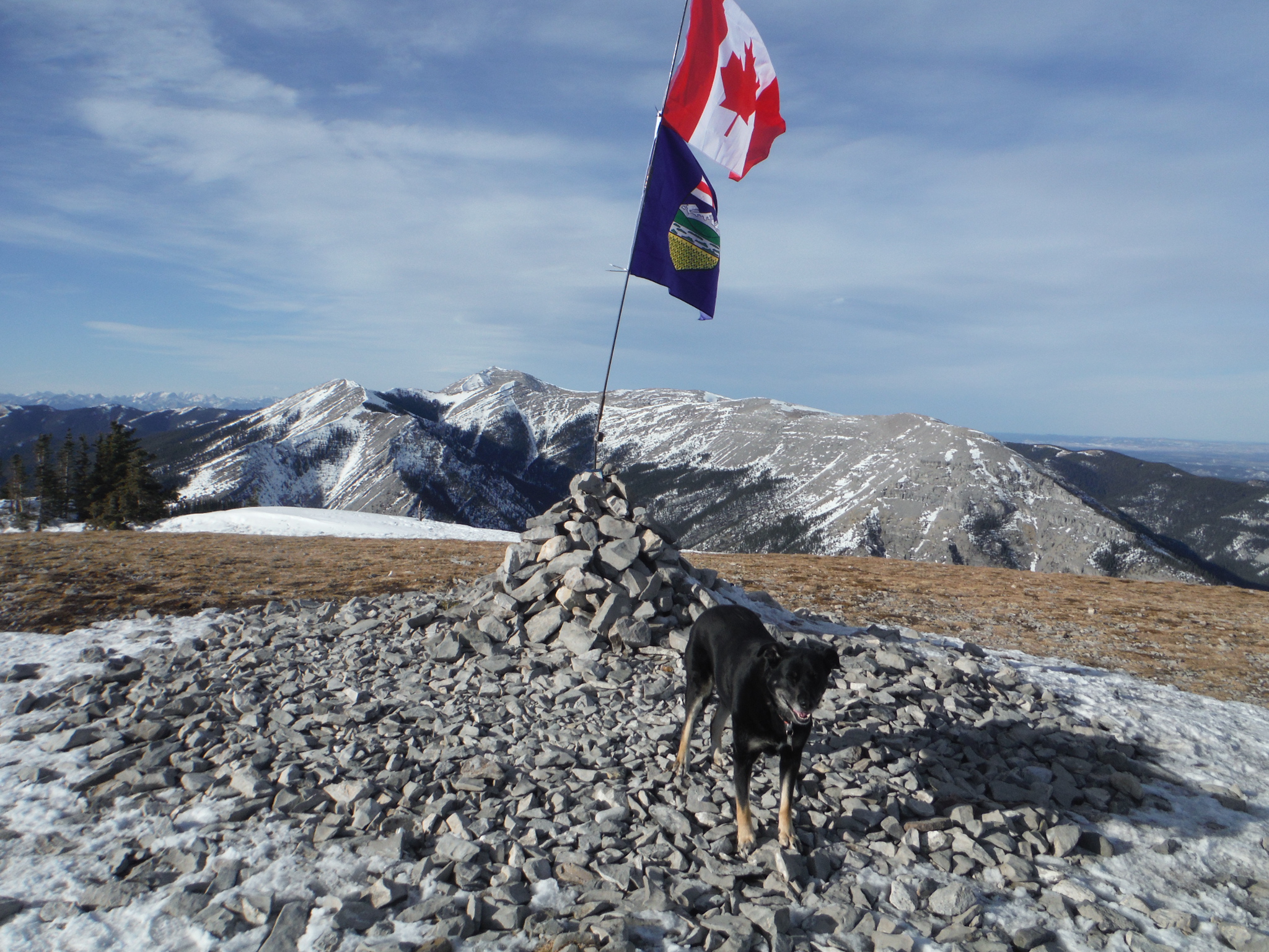 Kona on Prairie Mountain in early March. Moose Mountain behind.