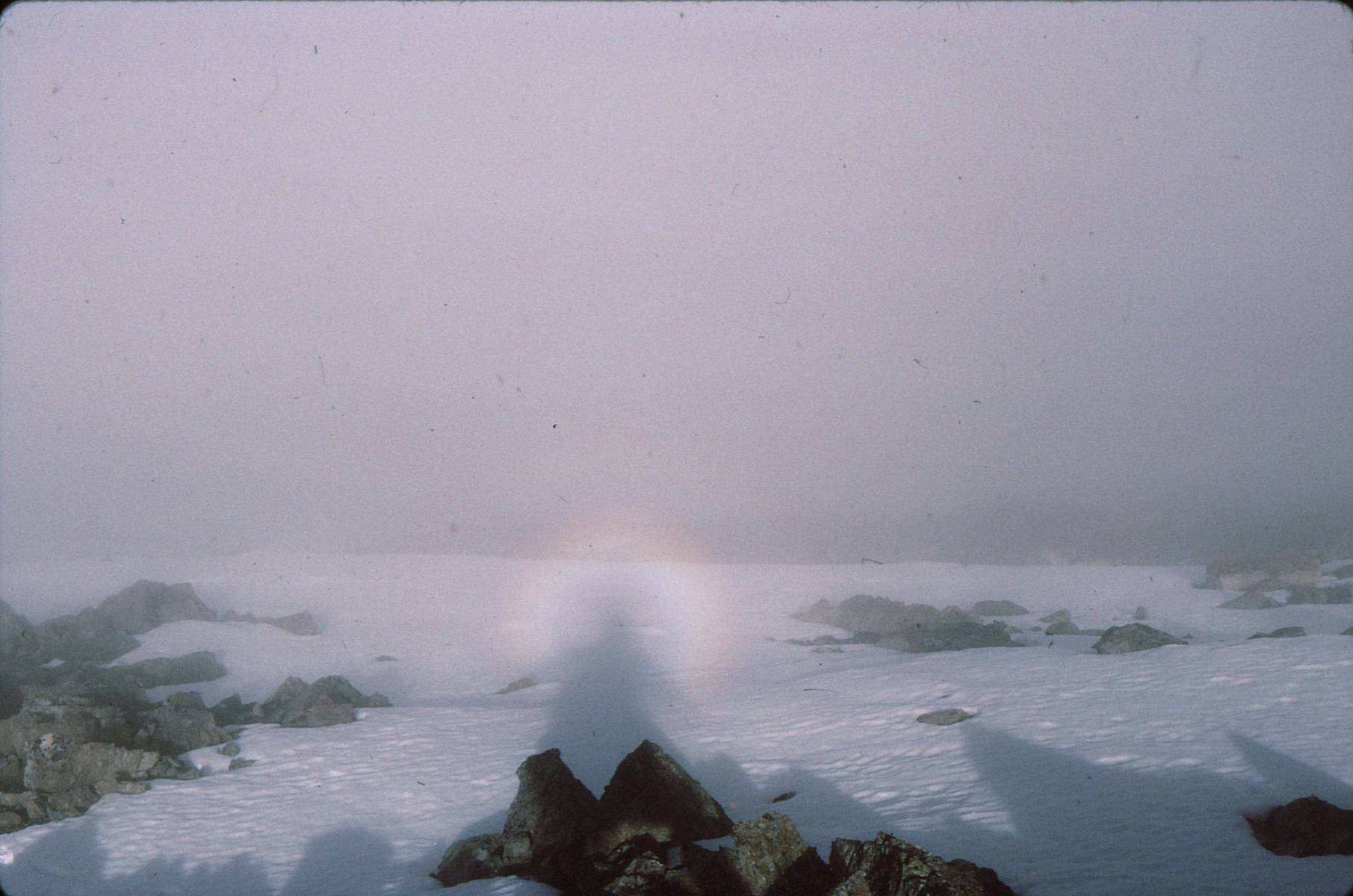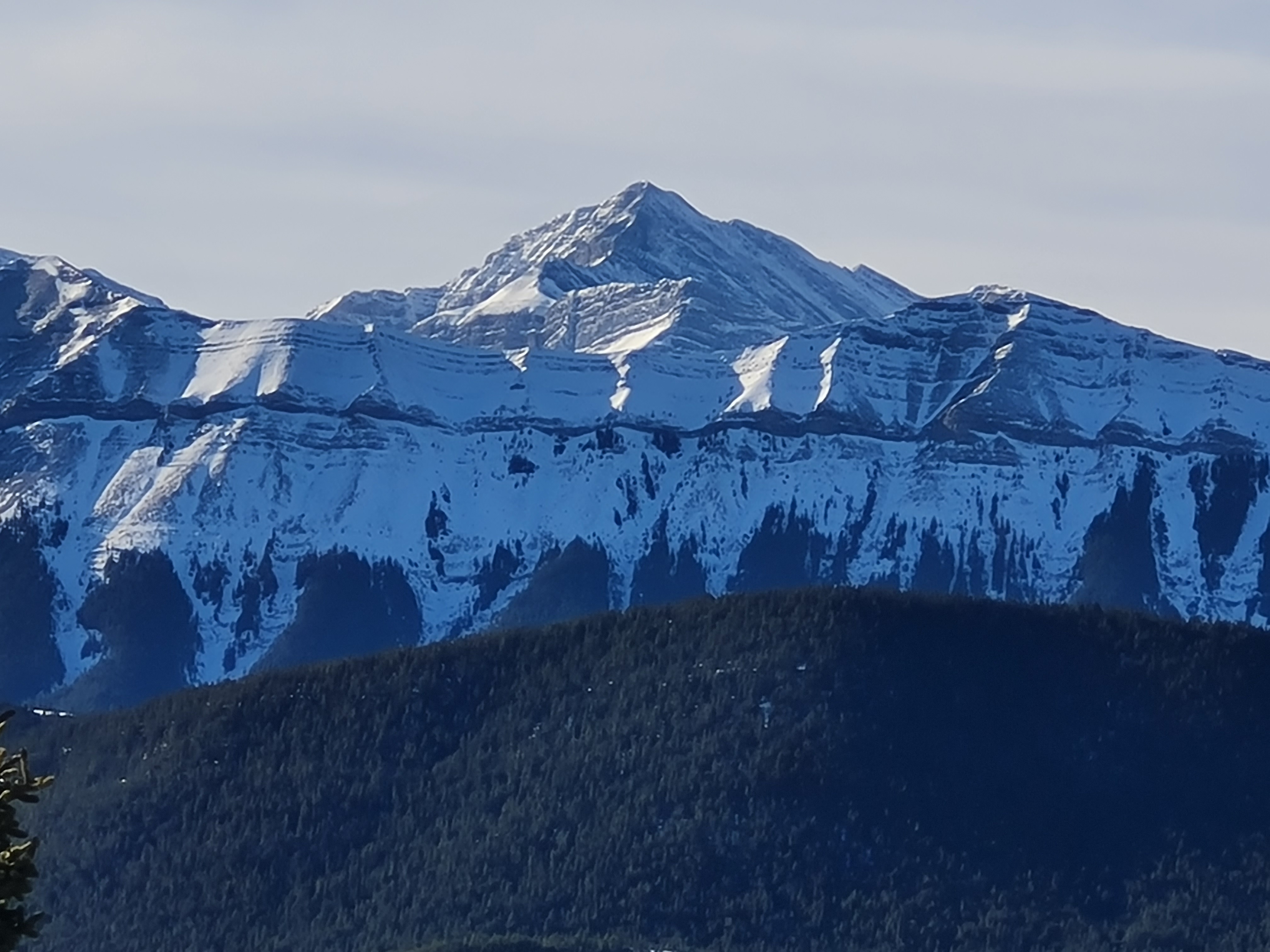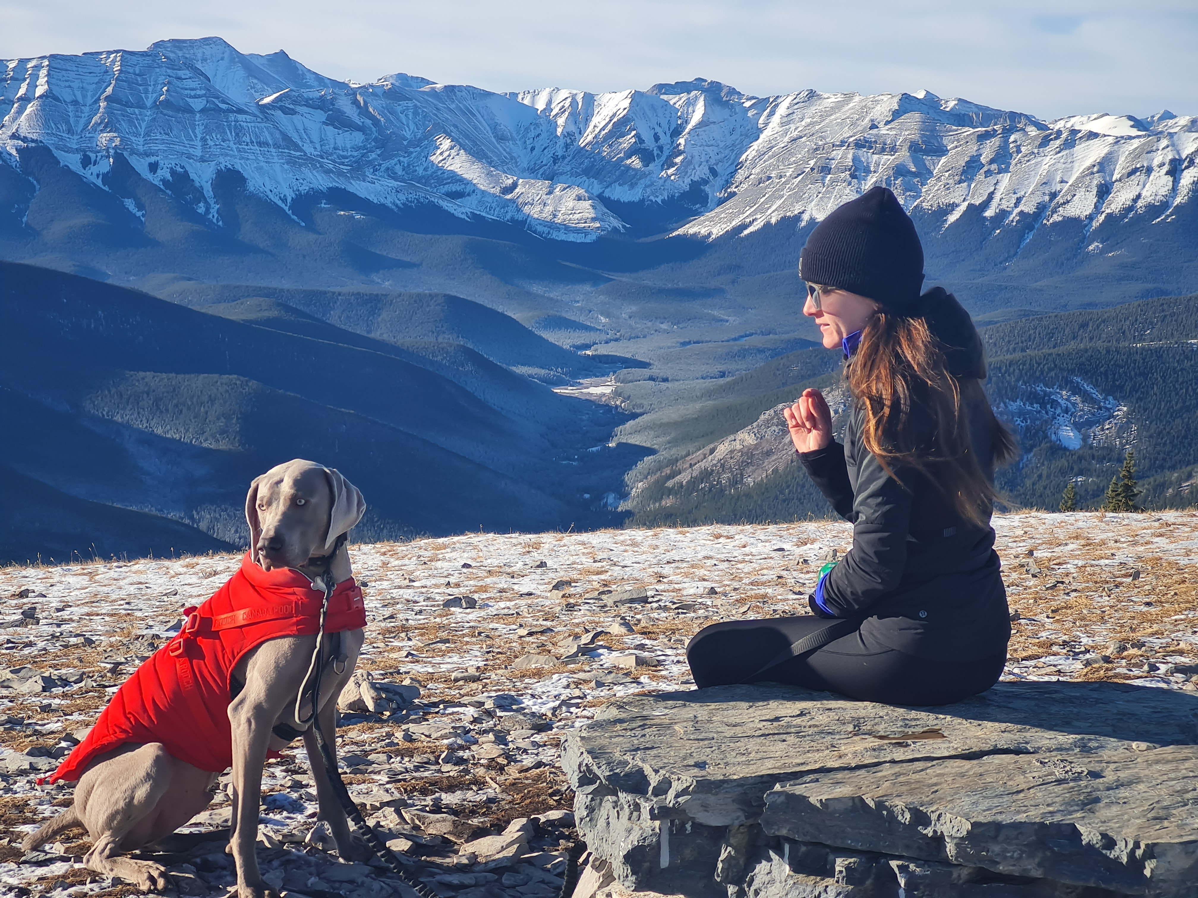 Kona on Midnight Peak in late January with Nakiska in background and on the horizon – Mts Bogart, Sparrowhawk, Wind and three Lougheeds. Mt. Allan and Lorette right of Nakiska.